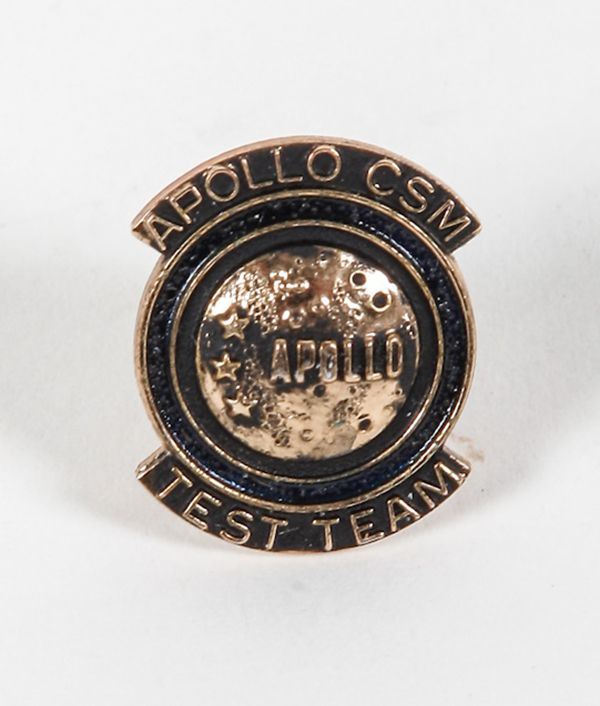 Rare "Apollo Csm Test Team" Lapel Pin. The pin is gold in color with "Apollo CSM" at the top and "Test Team" at the bottom of a globe with "Apollo" across the middle. These were undoubtedly scarce originally as they were probably only given to the Test Team members. They have undoubtedly been lost to collectors down through the years as this is the first we have seen in over 25 years of describing space memorabilia. A great find and a nice addition to any collection. Ex. the Michael Orenstein Estate Collection.