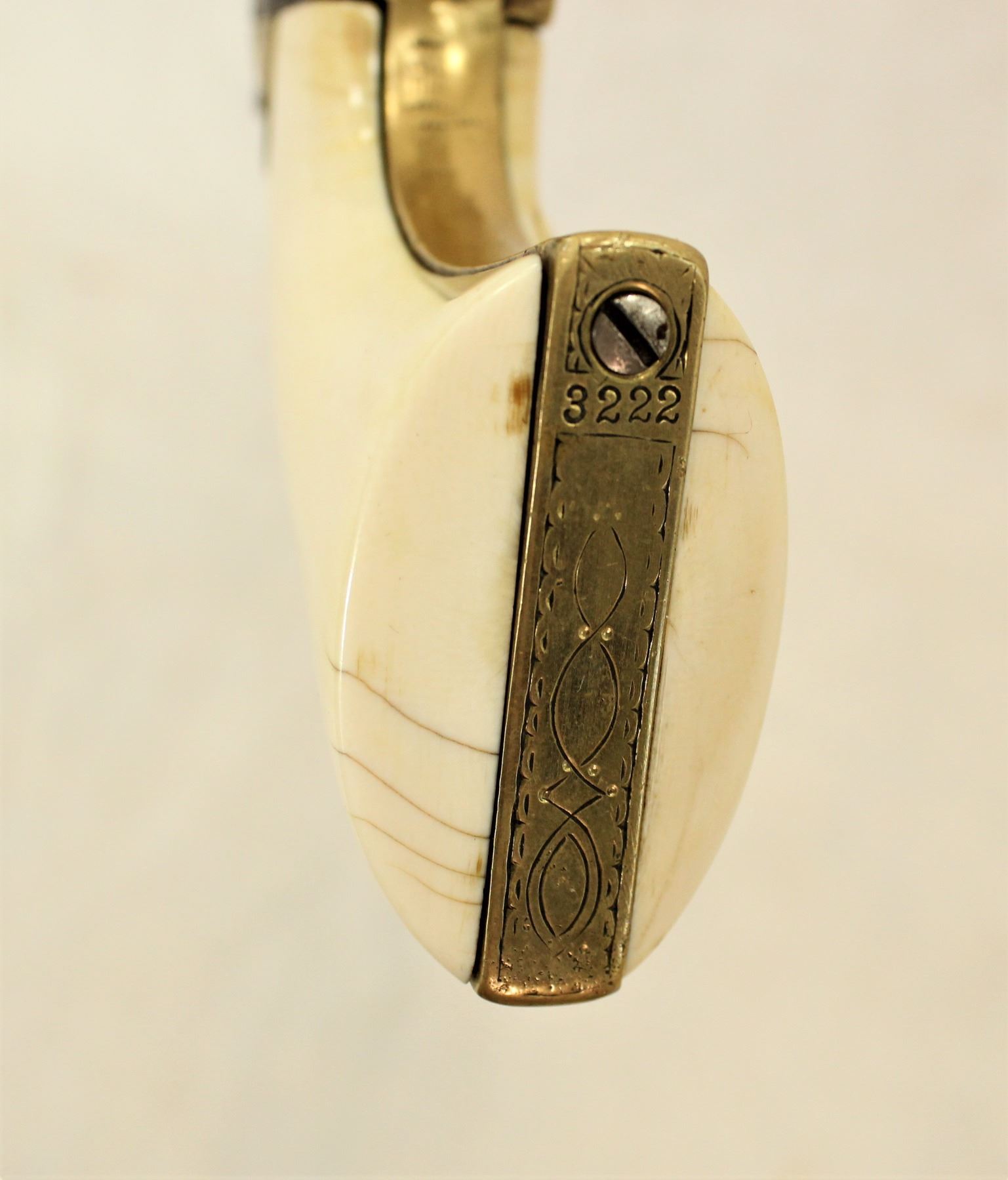 Serial #12867, 36 caliber, An interesting and extremely rare 1861 Navy revolver, factory engraved with a marked "I" mismatched trigger guard, accented by sensational carved Elephant grips, and with overall metal showing strong hints of faded blue finish and clear legends. Accompanied by