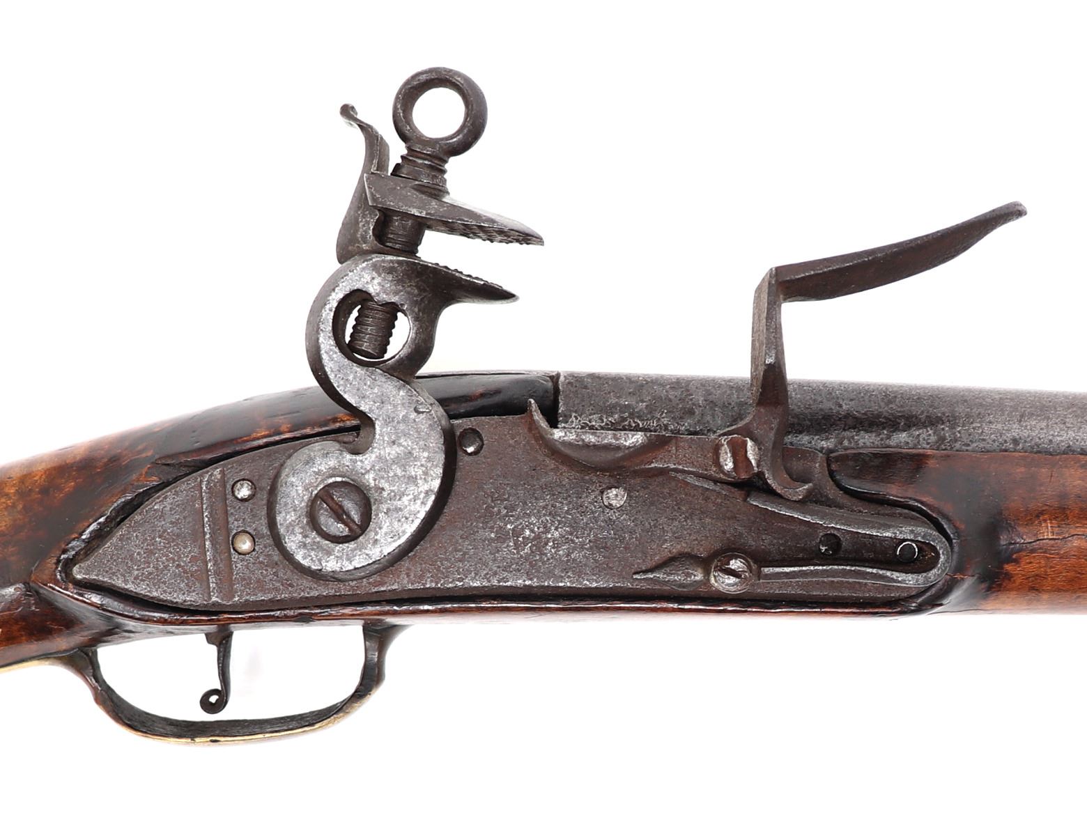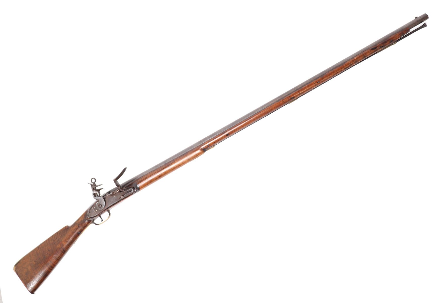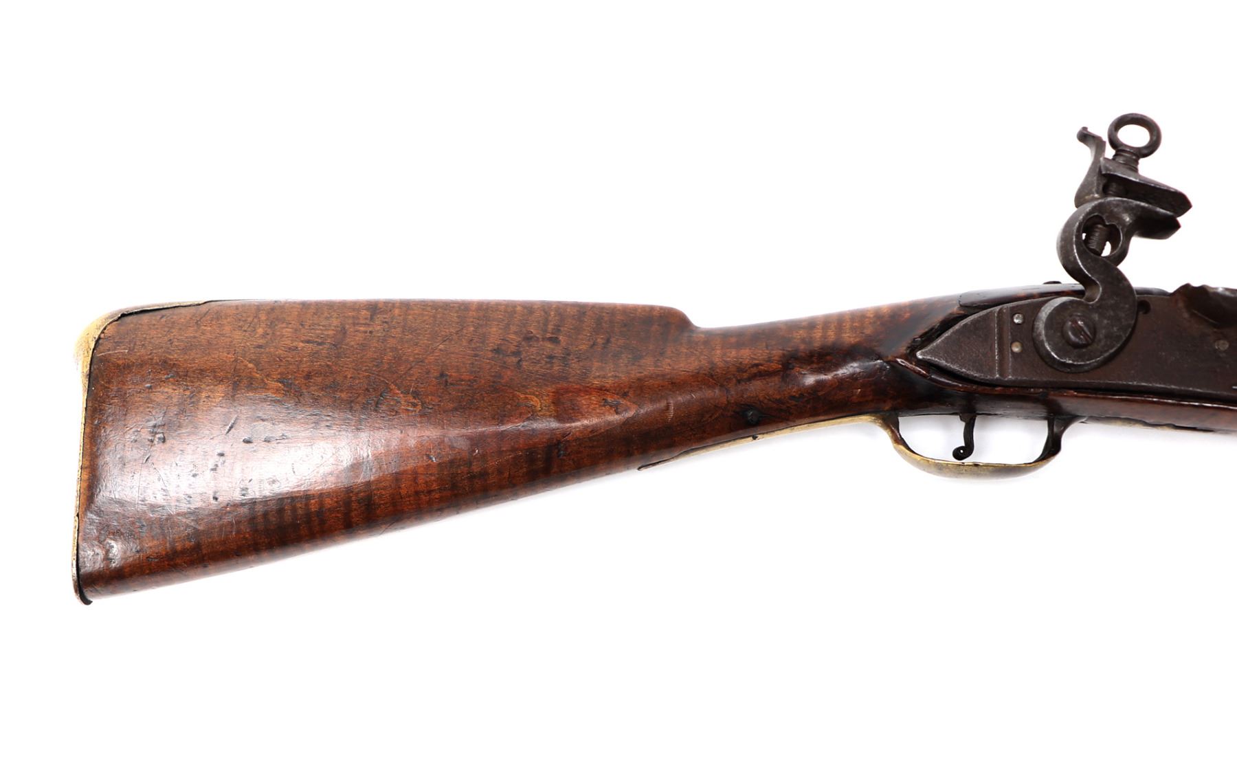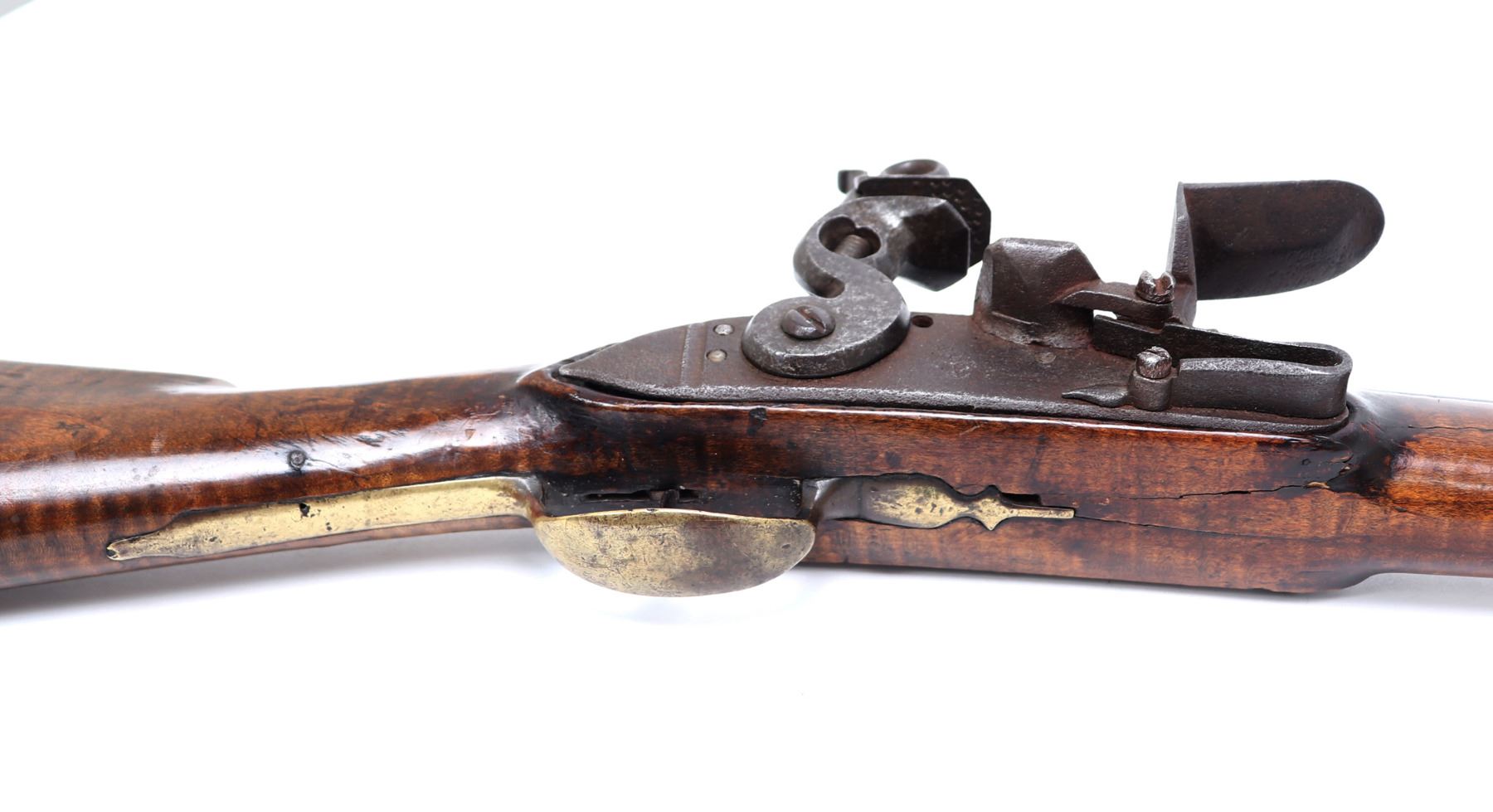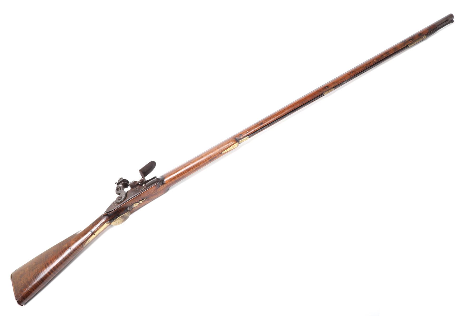 Rare American tiger maple Revolutionary War period flintlock rifle, 18th century (Anglo Spanish War 1779-1783). Flintlock firing mechanism with curlicue trigger. Round smooth bore barrel with brass forward sight and gilt brass mounts. Barrel marked with London proof marks, (P) with crown over in oval, (IO) under crown and (V) under crown in oval. Size 58" L, barrel 42 1/2" L. Provenance: Ex-Southwest Arms and Armour Collection