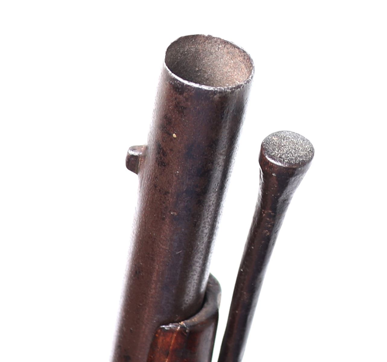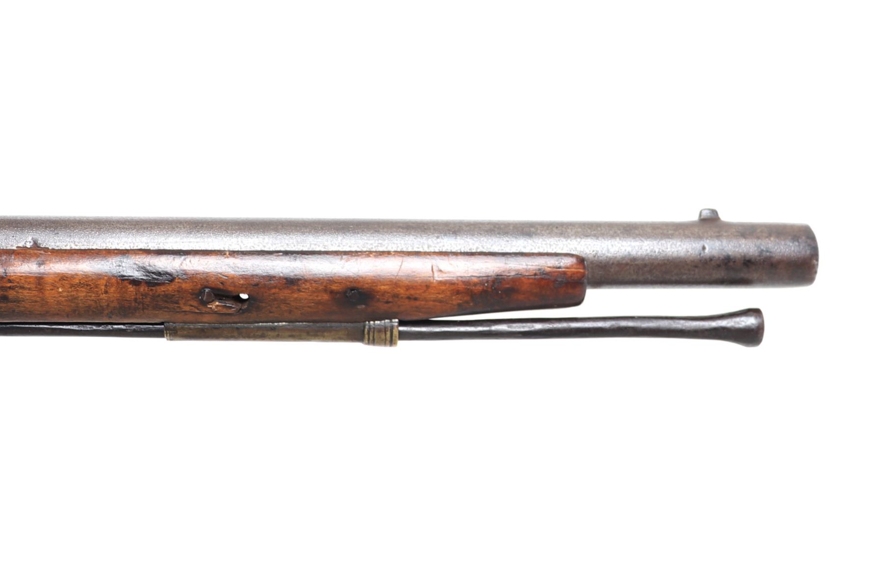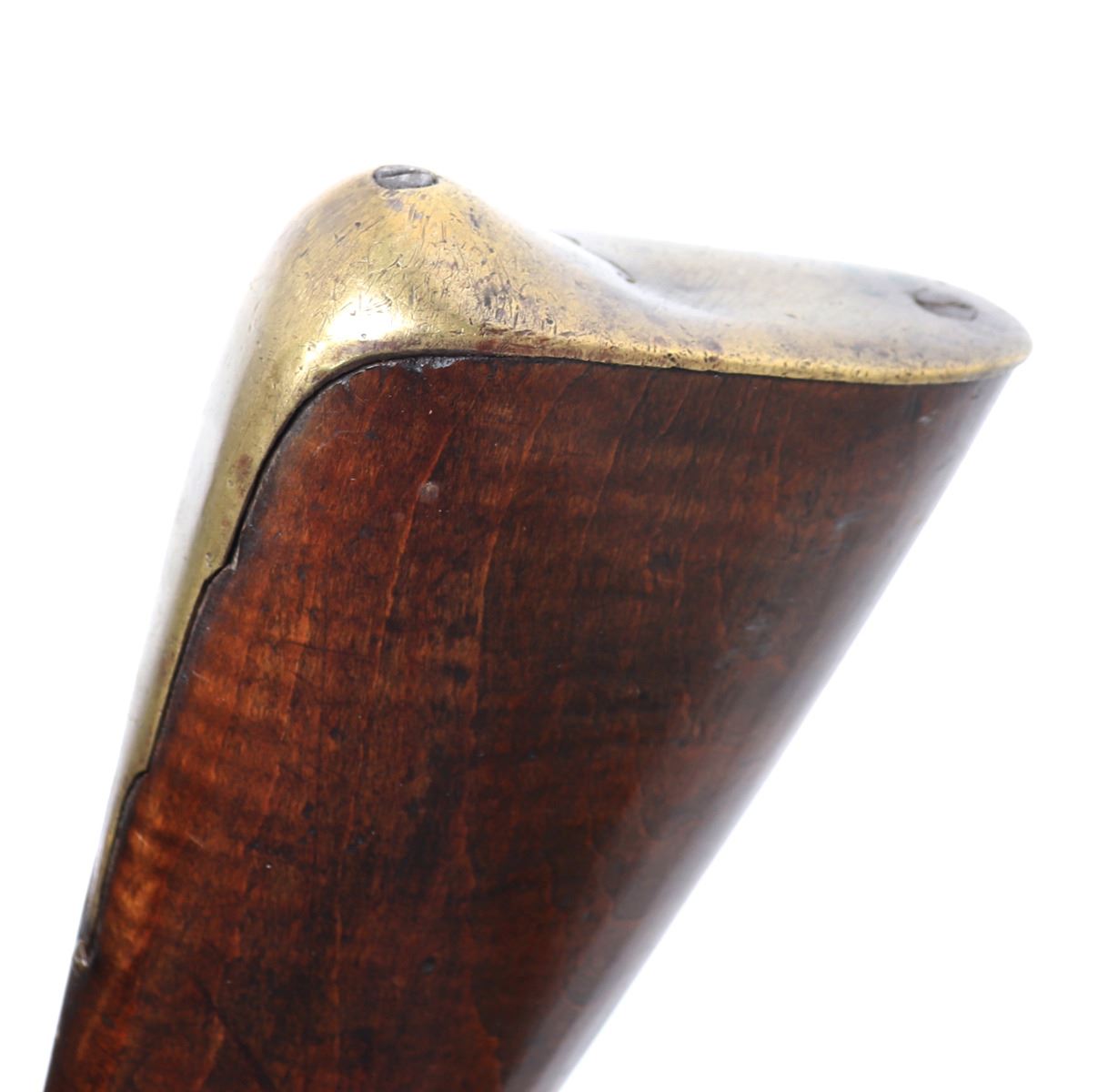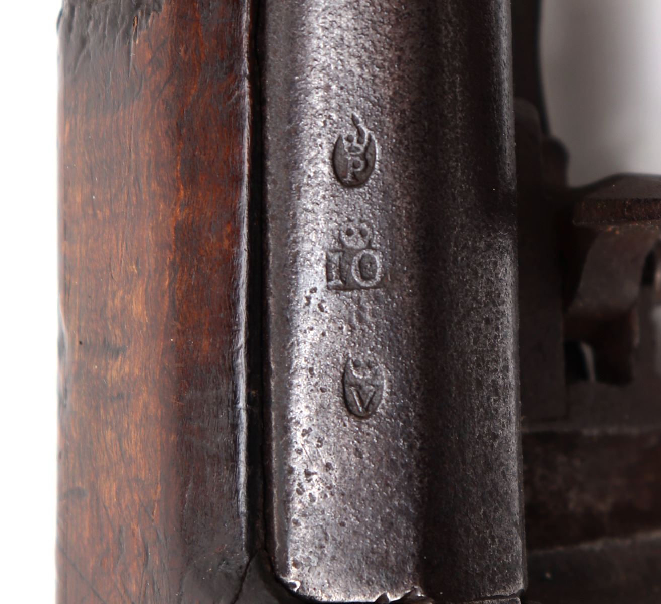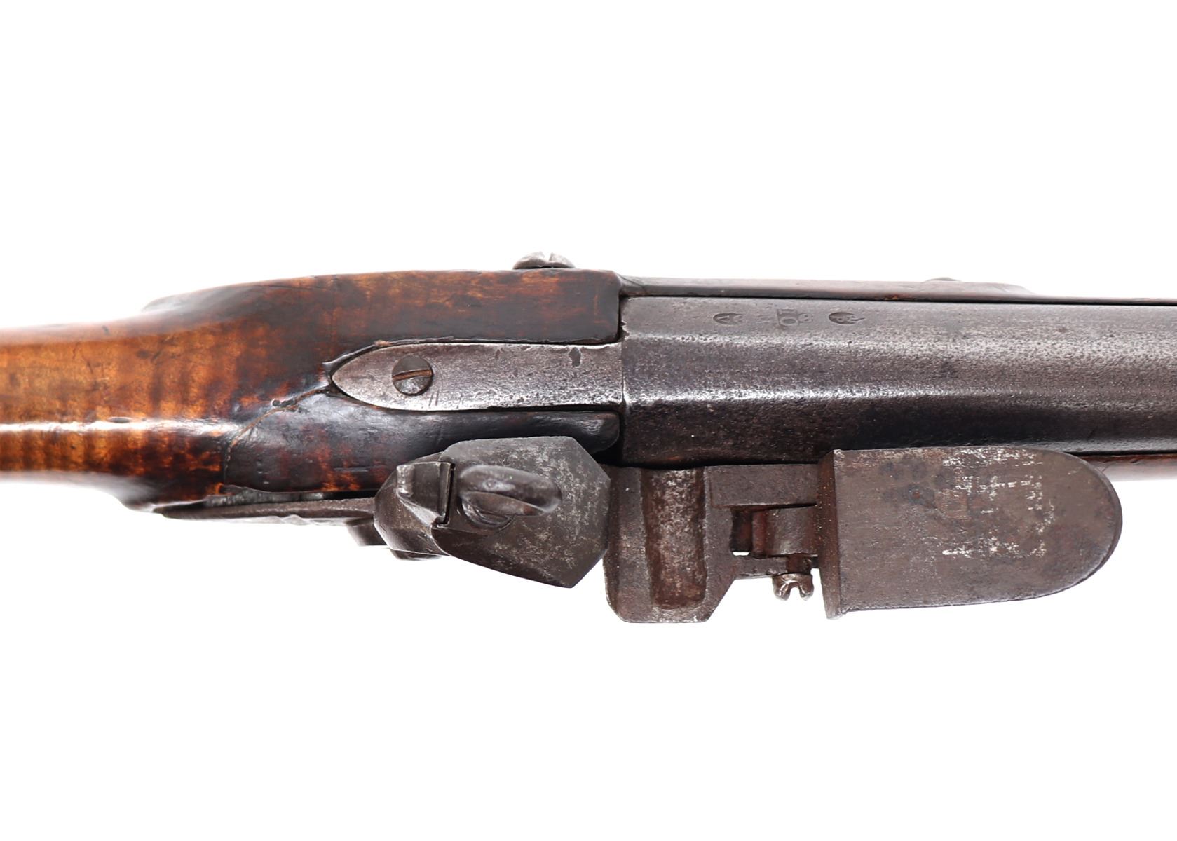 Rare American tiger maple Revolutionary War period flintlock rifle, 18th century (Anglo Spanish War 1779-1783). Flintlock firing mechanism with curlicue trigger. Round smooth bore barrel with brass forward sight and gilt brass mounts. Barrel marked with London proof marks, (P) with crown over in oval, (IO) under crown and (V) under crown in oval. Size 58" L, barrel 42 1/2" L. Provenance: Ex-Southwest Arms and Armour Collection