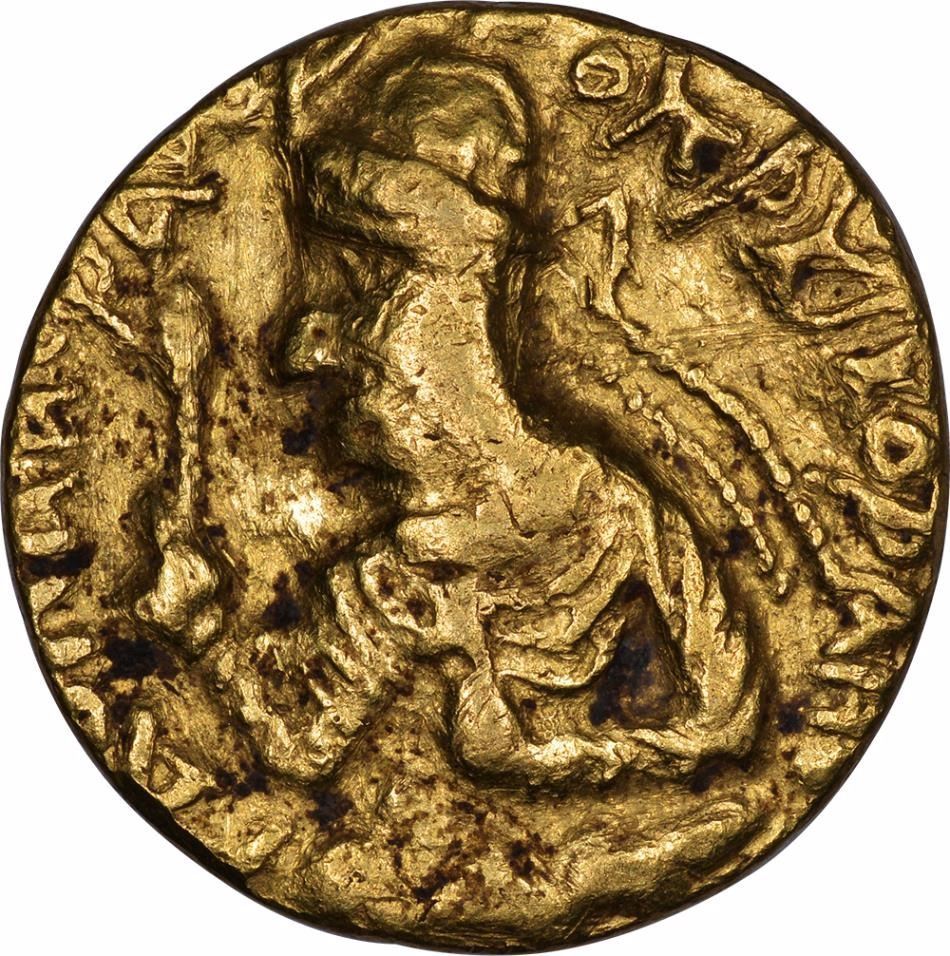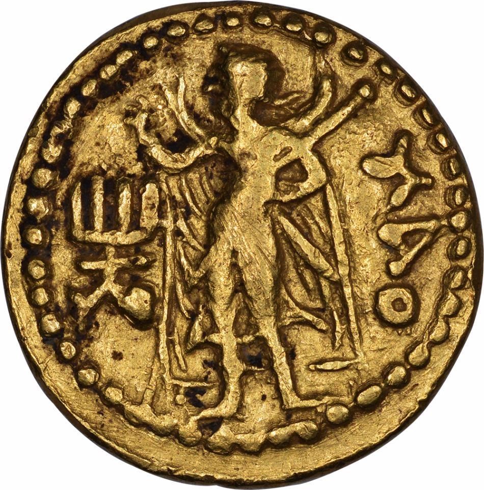 Kushan Dynasty, Huvishka (160-190 AD), Gold Dinar,Obv:diademed and crowned half-length bust left, holding mace-sceptre in one hand and the hilt of his sword with the otherand bactrian legend aroundþAONANOþAO OOηþKI KOþANO(King of Kings Huvishka Kushan),Rev:Mao (Lunar Diety) standing leftwith arm extended,lunar ’horns’ at shoulders,cradling filleted and globe-tipped scepter in left arm, and holding hilt of sword, tamgha in fieldand legend 'MAO'in the right field,(Gobl # 148),7.80g,19.51mm, about very fine, Rare.