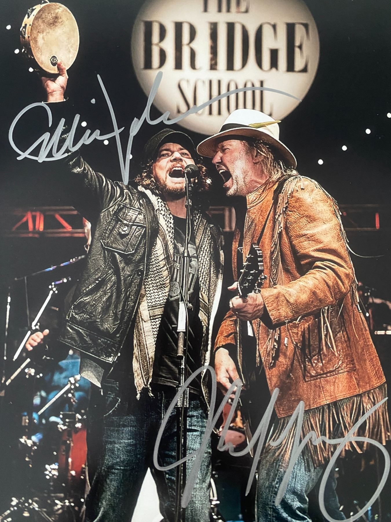 Rare Bridge School Benefit signed photo autographed by Neil Young and Eddie Vedder. 8x10 inches