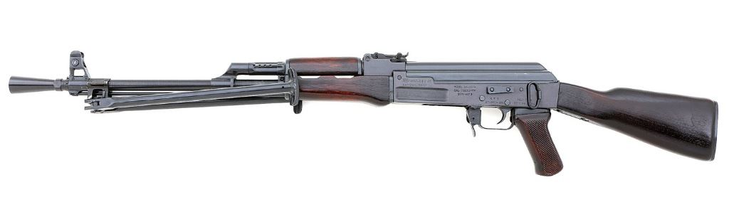 serial #NM47-02447, 7.62x39mm 20” National Match barrel with a touch of oxidation in the grooves about midway in an otherwise bright excellent bore. The metal surfaces of this rare target-inspired pre-ban rifle retain about 98% original blue with light operational wear on the magazine catch and some scattered light handling marks, the milled receiver toning just slightly plum. The bolt and carrier remain bright. The hardwood stock, checkered pistolgrip, and forend and handguard are in very good condition with some scattered light dings and minor handling marks, and all show an attractive dark red stain. The receiver shows the arsenal code for Factory 386 over “NATIONAL MATCH”, the model information and KFS importer mark stamped more rearwards, and the numbered parts are matching the rifle; the right rear of the receiver is also marked with three Chinese characters which appear to translate approximately to “precision gun”. The rifle retains the standard open sights, original flash hider, and features a spring-loaded bipod with 12” legs. Included is a canvas sling, steel 30-round magazine, fabricated heat shield, and a rubber stock extension/recoil pad. A rare variant of these desirable Chinese AKs, banned from import for decades. (14B11667-6) {MODERN} (3000/4000)