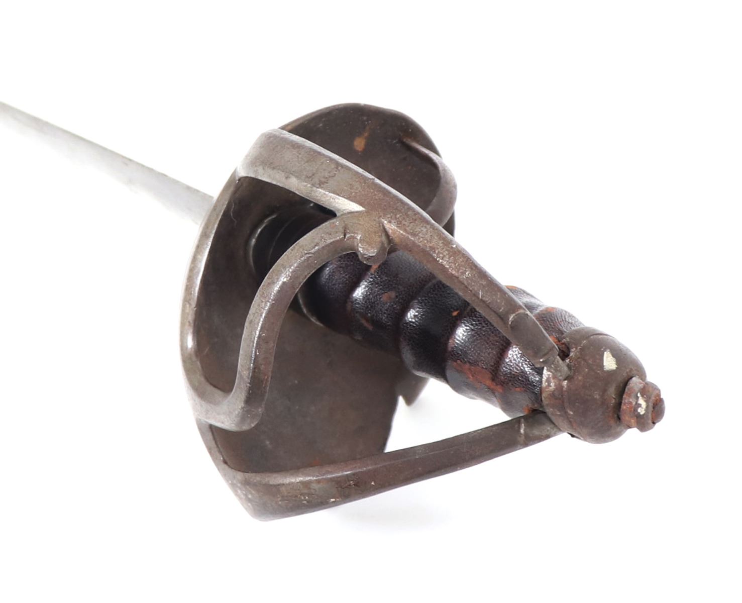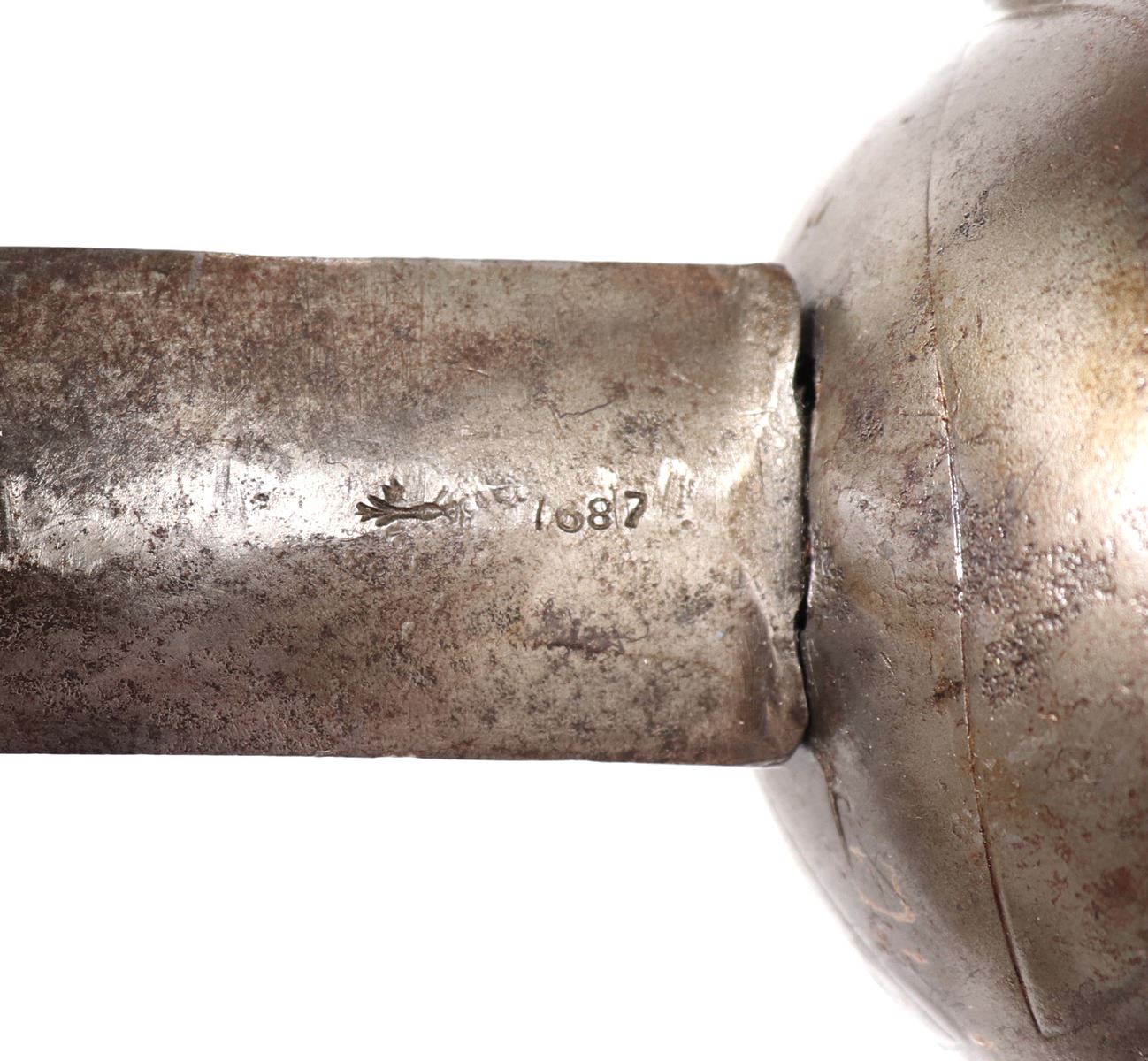 Early 18th C. rare broad sword with a Spanish military basket hilt. Curiously stamped with "R" and crown markings, stamped date 1687. Straight wide double-edged blade that gradually tappers to a point. Basket shaped bowl handle with three sweeping bars to a fitted pommel and leather grip. Hand peened. Size 36" L, blade 31" L. Condition: good condition with light wear overall. Provenance: Ex-USA Collection, Ex-Antique Arms Show