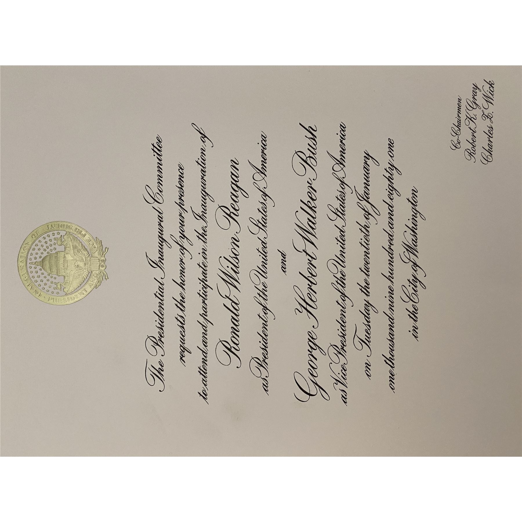 President Ronald Reagan, VP George H.W. Bush January 20, 1981 Inauguration Invitation. 8.5 x 11.5 inches