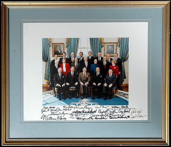 Reagan, Ronald. Official White House color photograph of President Reagan's Cabinet in 1986, signed by President Reagan, Vice President Bush, and each of the 18 Cabinet members. The photograph was matted and framed by the White House frame shop to an overall size of 19� x 16� in.