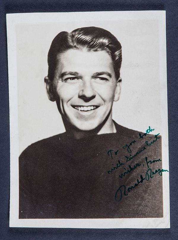 Reagan, Ronald. Vintage 5 x 7 in. photograph signed and inscribed, "To you both with sincere best wishes, from Ronald Reagan," n.p., n.d. Handsome photo of a very young Reagan, signed in green ink.