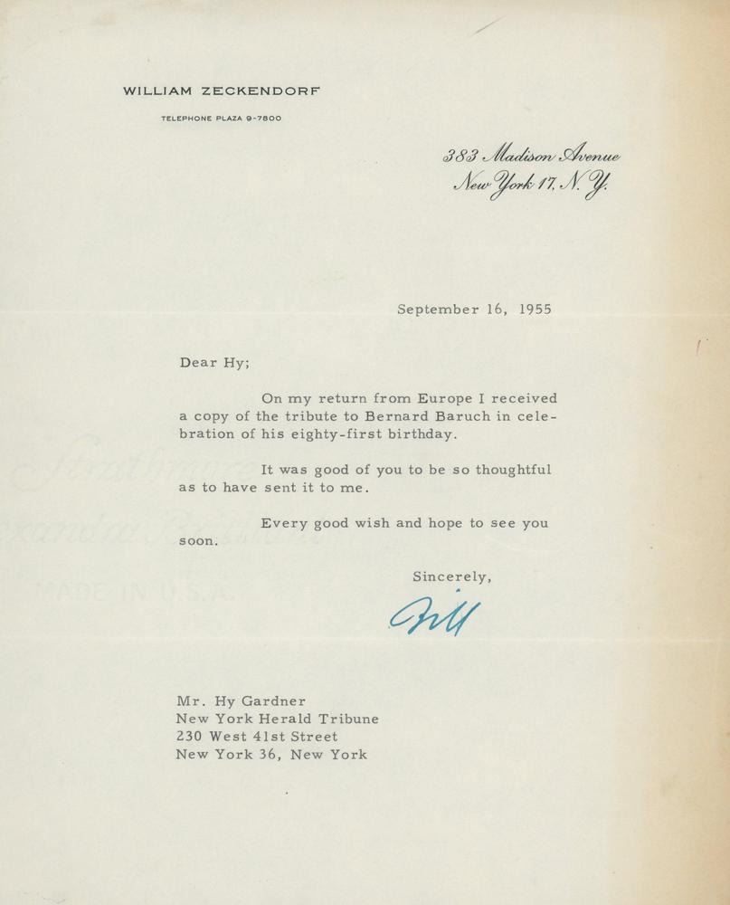 William Zeckendorf signed letter on personal stationery dated September 16, 1955
