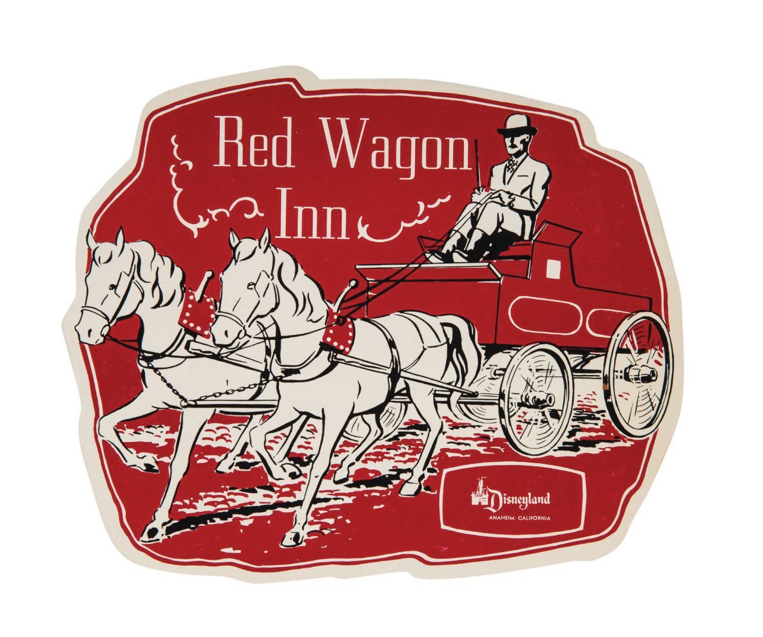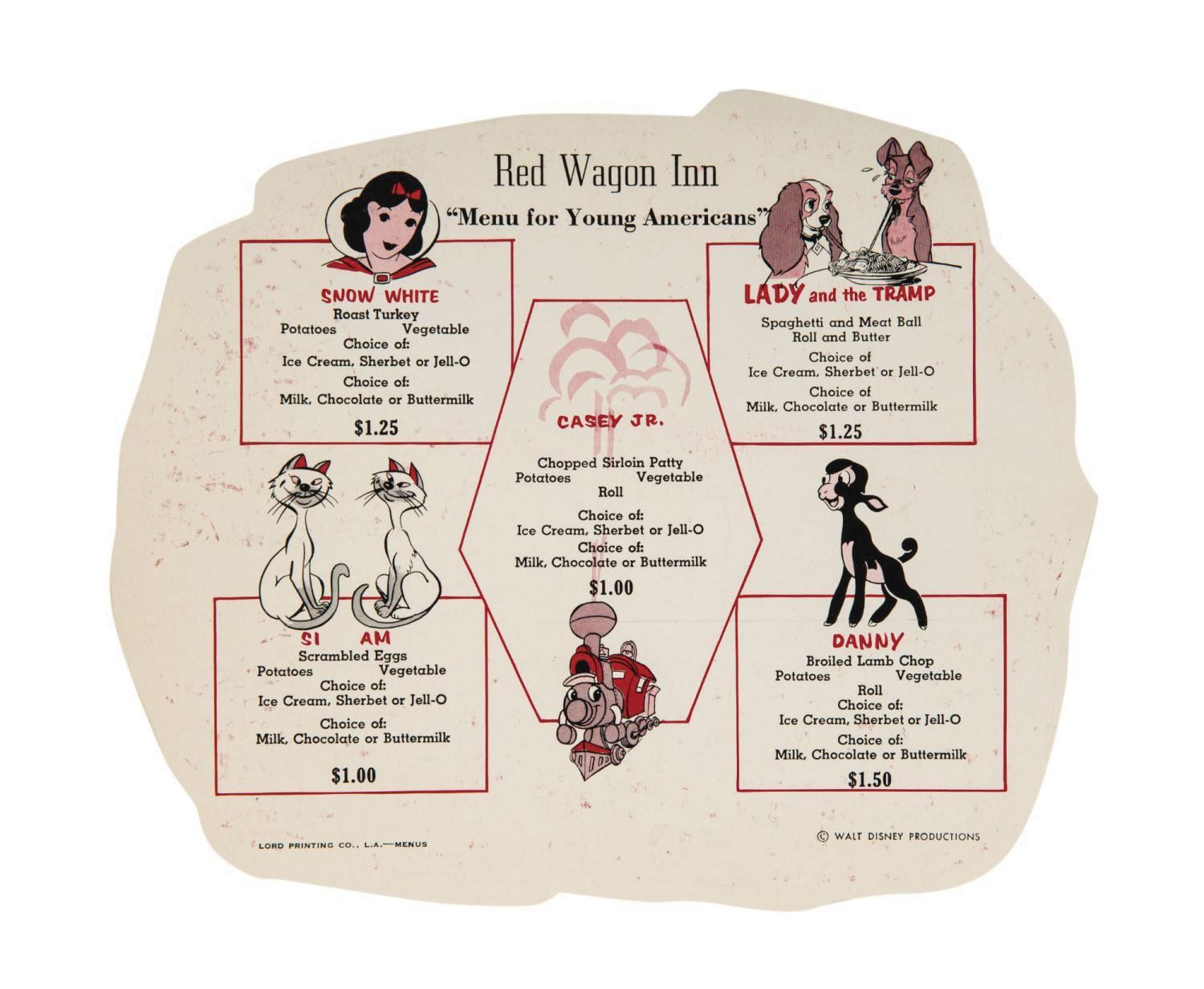 (Disneyland, c.1957) A child's menu from Disneyland's Red Wagon Inn. This stylish menu "for young Americans" features a horse drawn wagon on the front, with Si and Am from Lady and the Tramp as well as Danny from So Dear to My Heart on the reverse. Measuring 8"x9.5", the menu is in very good condition with minor edge-wear from use.