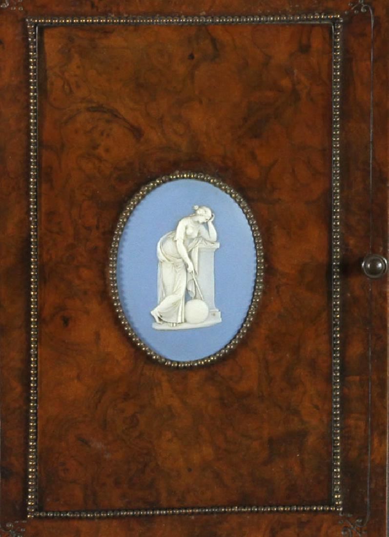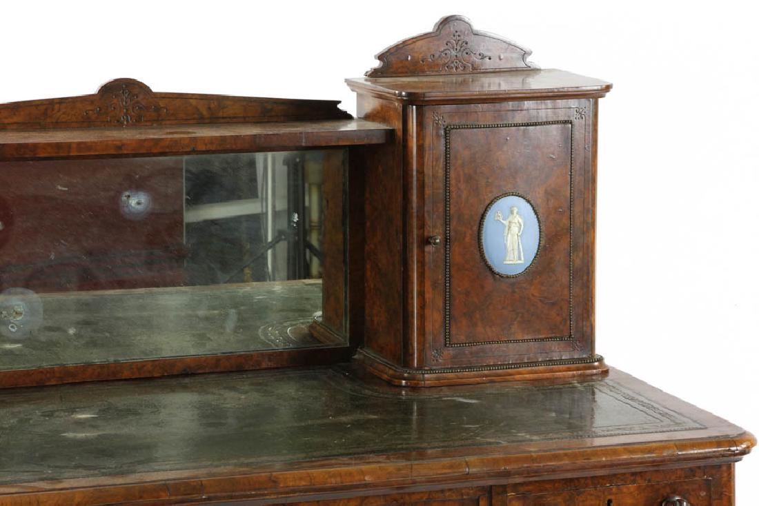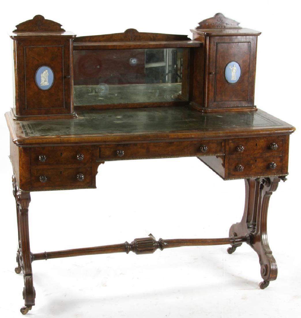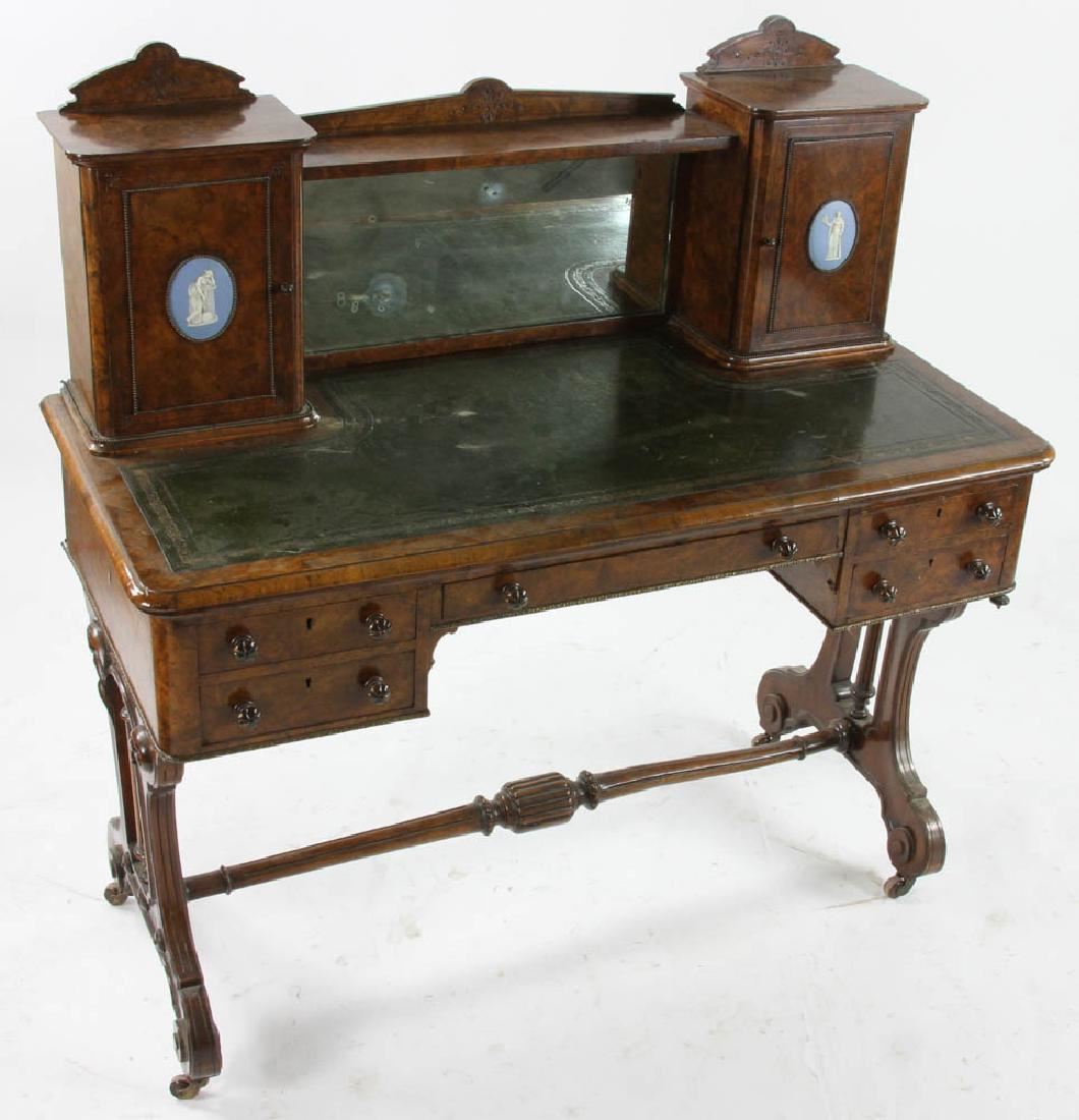 Regency burlwood writing desk, top with small cabinets inset with Wedgwood plaques, mirror and top shelf, desk top with molded edges and inset with green leather, five small drawers, scroll-carved legs with turned stretcher, 45" H x 44" W x 20 1/2" D. Provenance: Broomfield, Colorado estate.