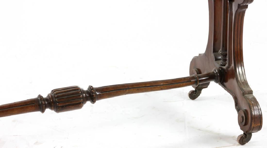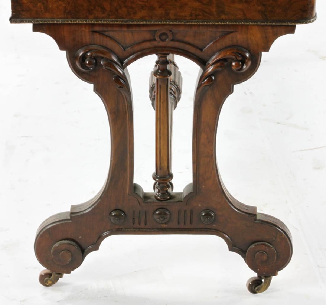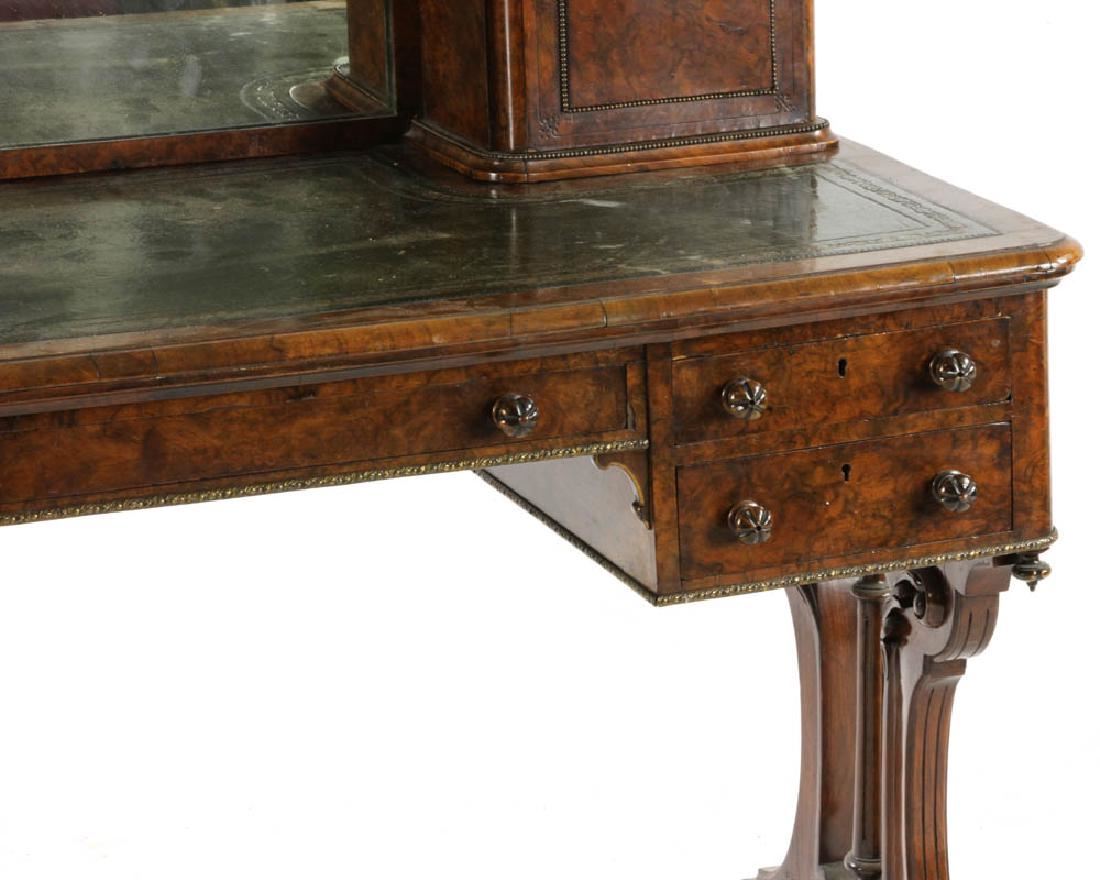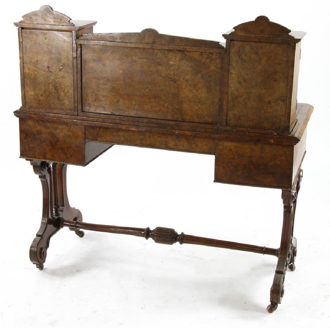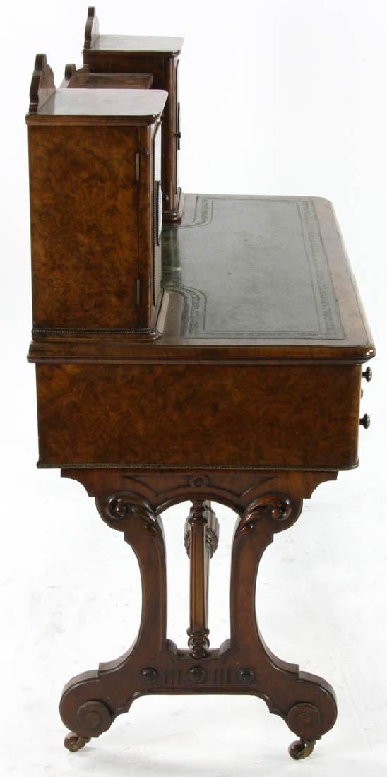 Regency burlwood writing desk, top with small cabinets inset with Wedgwood plaques, mirror and top shelf, desk top with molded edges and inset with green leather, five small drawers, scroll-carved legs with turned stretcher, 45" H x 44" W x 20 1/2" D. Provenance: Broomfield, Colorado estate.