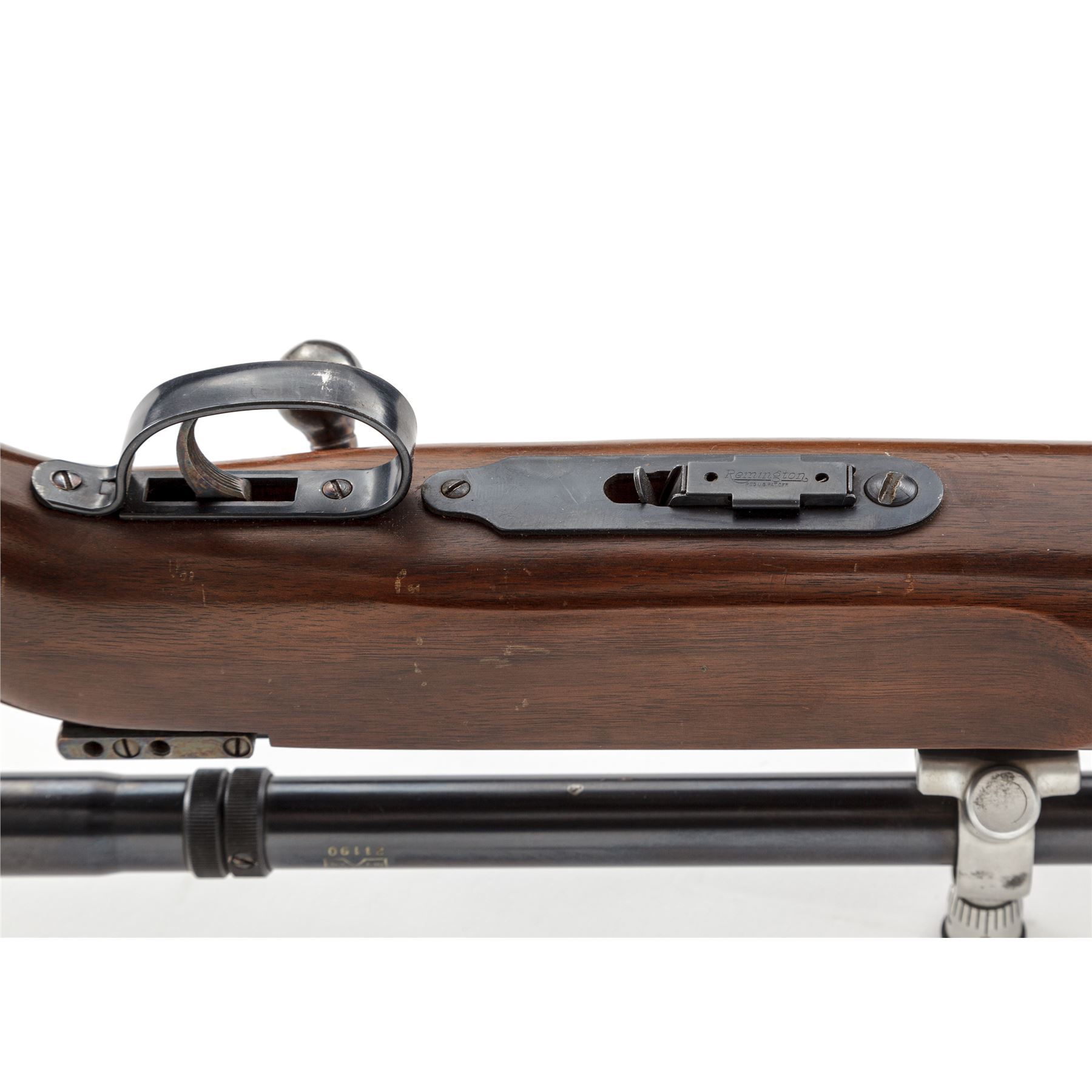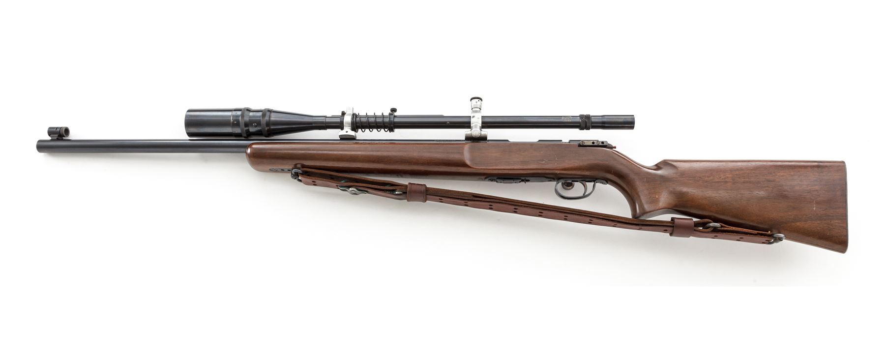 Remington 513-T Matchmaster Bolt Action Rifle, with Unertl Target Scope, #74226, .22 S-L-LR cal., 27'' barrel, blue finish, color case hardened bolt and receiver sight block; one-piece smooth pistol-grip walnut target stock, checkered steel buttplate, sling swivels, 1-1/4'' brown leather sling, globe front sight, with one factory magazine. Topped with a Unertl 10X target scope and adjustable aluminum Unertl mounts with recoil spring, threaded lens covers; scope is #21190 with fine crosshair reticle, blue finish, 25-1/8'' overall with a 3/4'' tube. Rifle with standard markings and ''XPP'' date code, mfg'd 1945. Metal is excellent retaining approx. 97% original blue finish, a little thinning on the triggerguard and magazine well accounts for most of the finish loss. Barrel address and other factory lettering is crisp and clear. Stock is very good retaining a majority of its varnish with some thinning and finish loss at the wrist and forend; wood with general small impressions and shallow scratches, all are pretty normal signs of handling and range wear; used but not abused. Bolt, scope block, and trigger retain most of their case colors. Very good smooth action, excellent clean bore. Scope is also excellent with only intermittent minor marks to the exterior, aluminum rings with a little dark spotting, optics are clean and clear. Est.: $800-$1,200. (C&R)