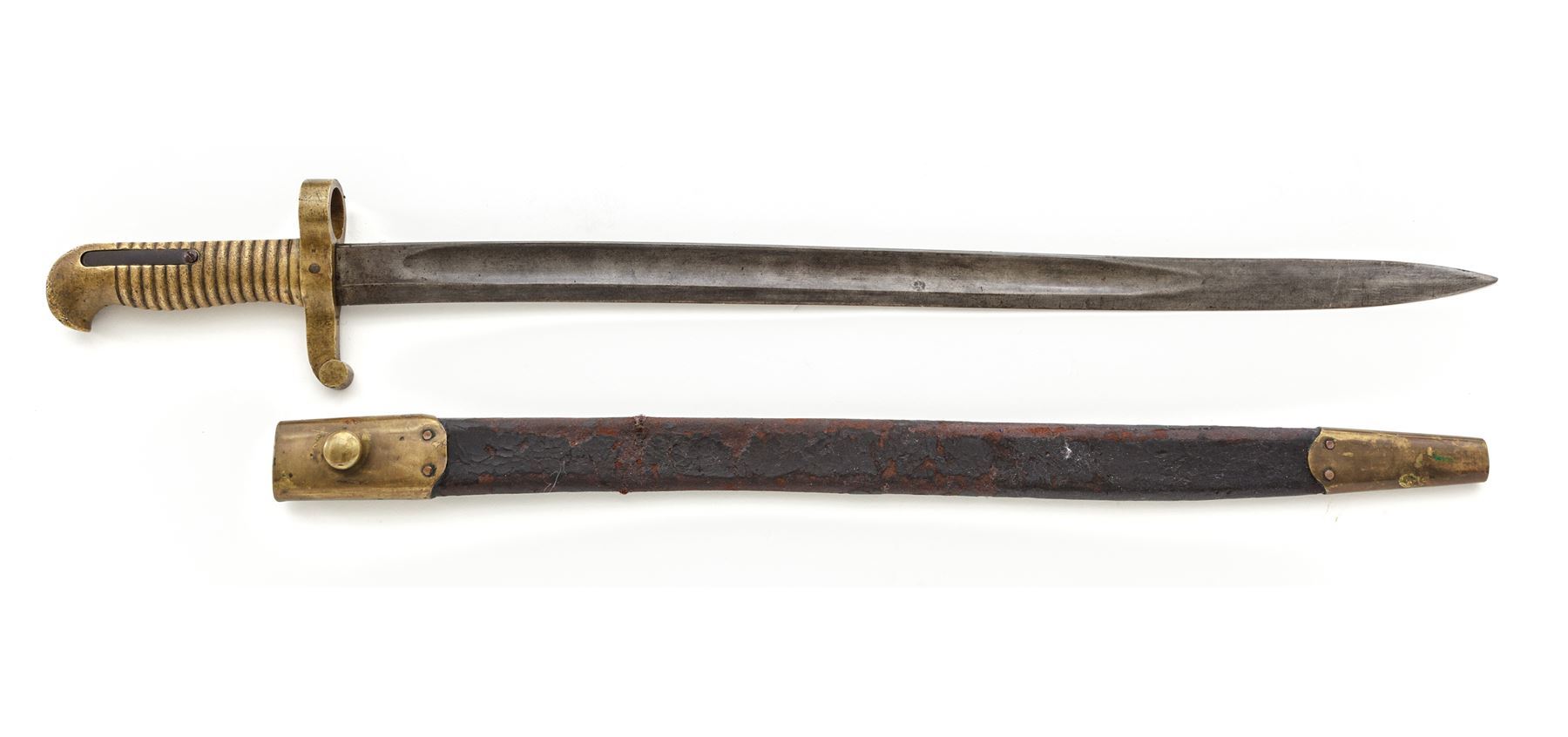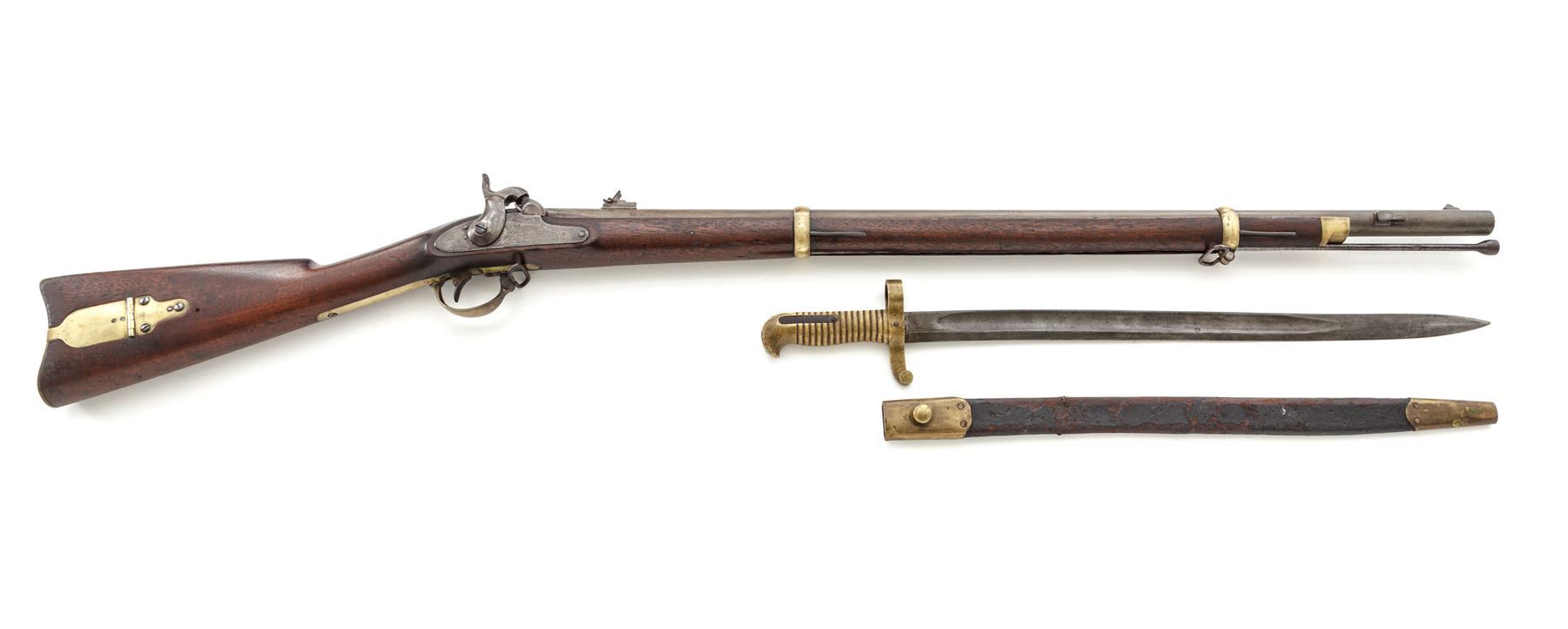 Civil War U.S. Model 1863 ''Zouave'' Contract Muzzleloading Percussion Infantry Rifle, by Remington, with saber bayonet and scabbard, NVSN, .58 cal., 33'' round barrel with block-blade front and three-leaf rear sights and bayonet lug on right side at muzzle, marked ''V/P/(eagle head)'' and ''1863'' at breech; bevel-edge lockplate is marked with a spread-wing eagle clutching olive branches over ''U.S.'' and ''Remington's/Ilion, N.Y.'' ahead of hammer and ''1863'' behind; brass furniture including triggerguard with iron sling swivel at front, small patchbox opening to a buttstock trap containing a spare nipple, buttplate marked ''U.S.'' on top tang, two spring-retained barrel bands (top with iron sling swivel), and nosecap; oil-stained walnut fullstock; steel tulip-head ramrod. Mfg'd ca. 1862-65. Condition is very good to near fine, the steel parts having a clean and smooth gunmetal gray-brownish patina (with minor pitting at breech), sharp edges and clear markings, the brass parts with a soft age patina. Stock is smooth and solid showing pleasing grain and color and only minor handling/use marks (heavier on left side between bands) and a fairly sharp inspector's cartouche on left sideplate apron. Correct brass-handled bayonet having a smooth, clean steel blade; matching scabbard with brass frog and drag and flaking but intact leather. The Remington ''Zouave'' rifle is a favorite among collectors. Est.: $2,500-$3,500. (Antique)