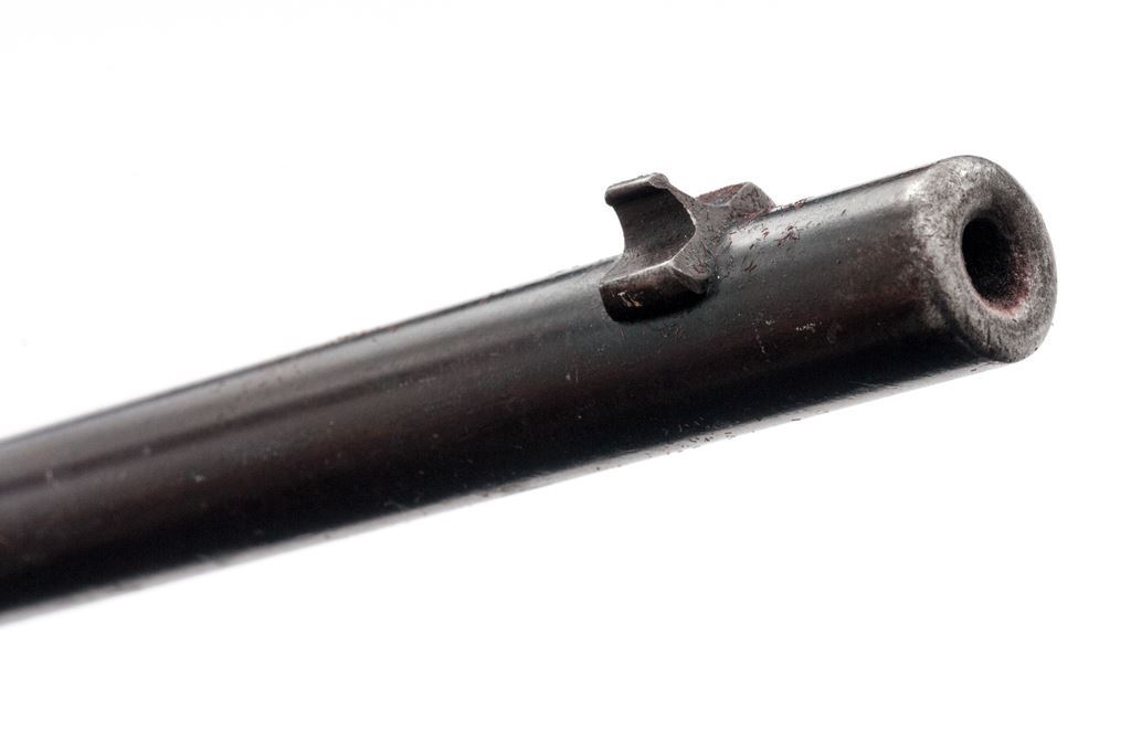Remington Model 12A Pump Action Rifle, #100145, .22 S-L-LR RF cal., 22" round barrel marked with Model #–Remington-UMC name, address, and 1909-10-11-12 Pedersen's patent dates on top, "Remington/Trade Mark" and caliber at breech, has standard open sights, half-mag; receiver has knurled take-down screw at left, right ejection, separate trigger guard with sliding safety, circular Rem.-UMC logo at lower tang; varnished walnut sliding forearm with grooves, matching buttstock with flat copper buttplate having stamped designs. Mfg'd 1909-36. Condition is good retaining traces of barrel blue, blue-brown receiver with scattered discoloration, sharp edges, and mostly clear markings; buttplate is a replacement. Stocks are sound: forend has long cracks at rear screw on both sides, buttstock is smooth with minor marks. Action is smooth, bore shows frosting and fine rifling. Est.: $300-$400. (C&R)