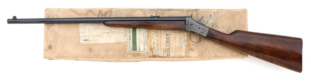 serial #346298, 22 LR, 22 1/2'' round barrel with a mostly bright very good plus bore showing some scattered mild oxidation and strong rifling throughout. The barrel retains about 97% of an older nice quality restored polished blue showing some scattered light handling marks. The markings remain strong showing combination Remington Arms Co, Inc. / Remington Ilion Works address and the action retains perhaps 85% nice original case-hardened colors that are drifting to a pleasant smoky gray case-hardened patina and showing a little minor freckling. The small action parts retain about 95% original blue and the takedown screw shows good fire blue. The smooth walnut buttstock and forend remain in very fine condition showing a little older added varnish with some scattered light dings and a slight gap where the forend meets the frame. The buttplate shows Remington UMC logo and strong original blue. The original sporting sights are intact, the rear missing its elevation screw, and the action seems to function normally. The rifle includes an original factory box in very good condition showing some light staining and flaking from the years but otherwise remaining quite sound. The lid shows a later marking in pen ''Rem #4 / 22 Good / 7/19/54'' and the lid otherwise shows a variety of period shipping labels with 1930s dates. A very good ensemble for the Remington collector. (13A10826-187) {C&R} [Dr. W. Lloyd Hudson, Jr. Collection] (800/1200)