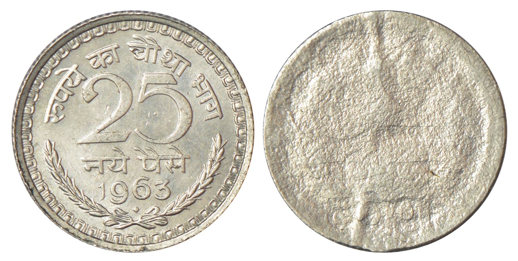 1963, nickel, 25 naya paise, Bombay mint, reverse brockage (lakhi), weak struck, 2.58g.