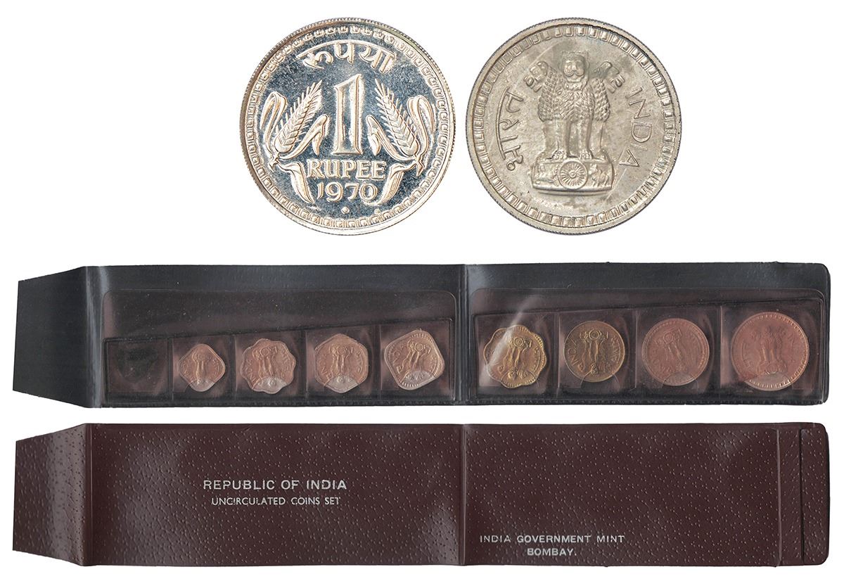 Republic India: 1970, Strip Packing, UNC set of 8 coins, 1 rupee, 50 paise, 20 paise, 5 paise,