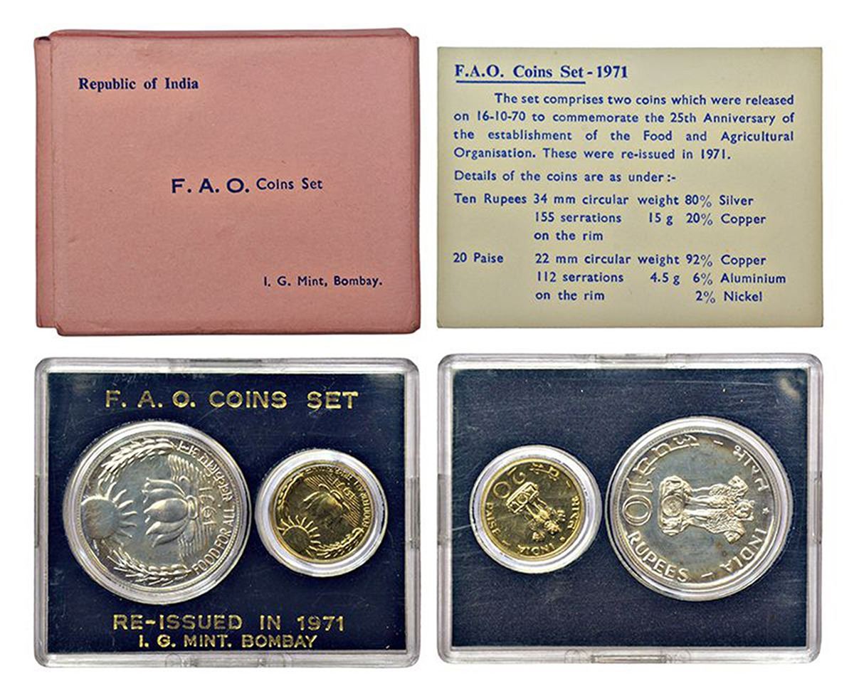 1971, Food for All, UNC set of 2 coins, 10 rupees and 20 paise, Bombay mint, RB 29, in original mint packing,