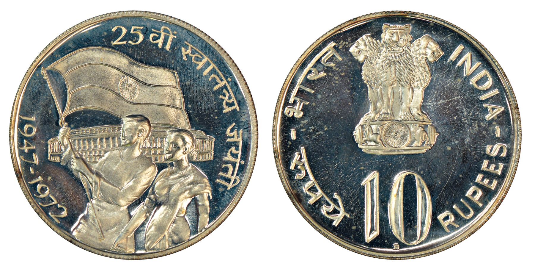 1972, 25th Anniversary of Independence, proof silver 10 rupees, Bombay mint, KM 187.1.