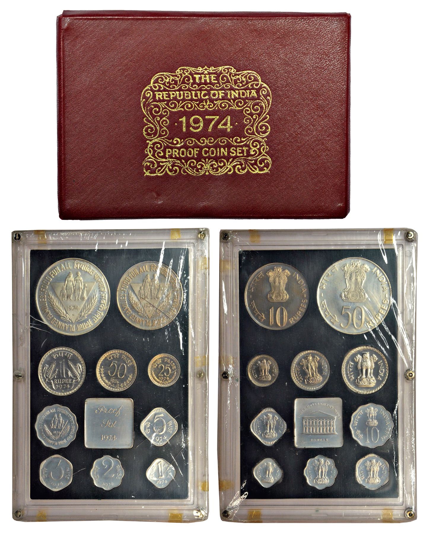 1974, Planned Families, Food for All, Proof set of 10 coins, 50 rupees, 10 rupees, 1 rupee, 50 paise, 25 paise, 10 paise, 5 paise, 3 paise, 2 paise and 1 paisa, Bombay mint, RB 41, few minor crack on inside plastic box.
