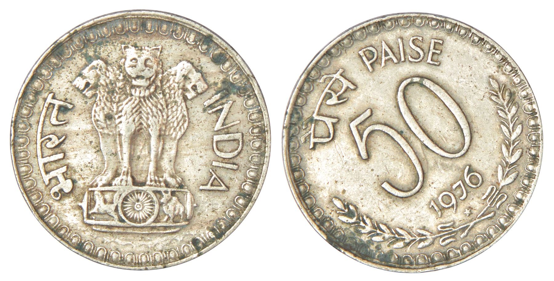 1976, cupro-nickel 50 paise, Hyderabad mint, die-axis 10 o'clock on reverse, 4.89g.