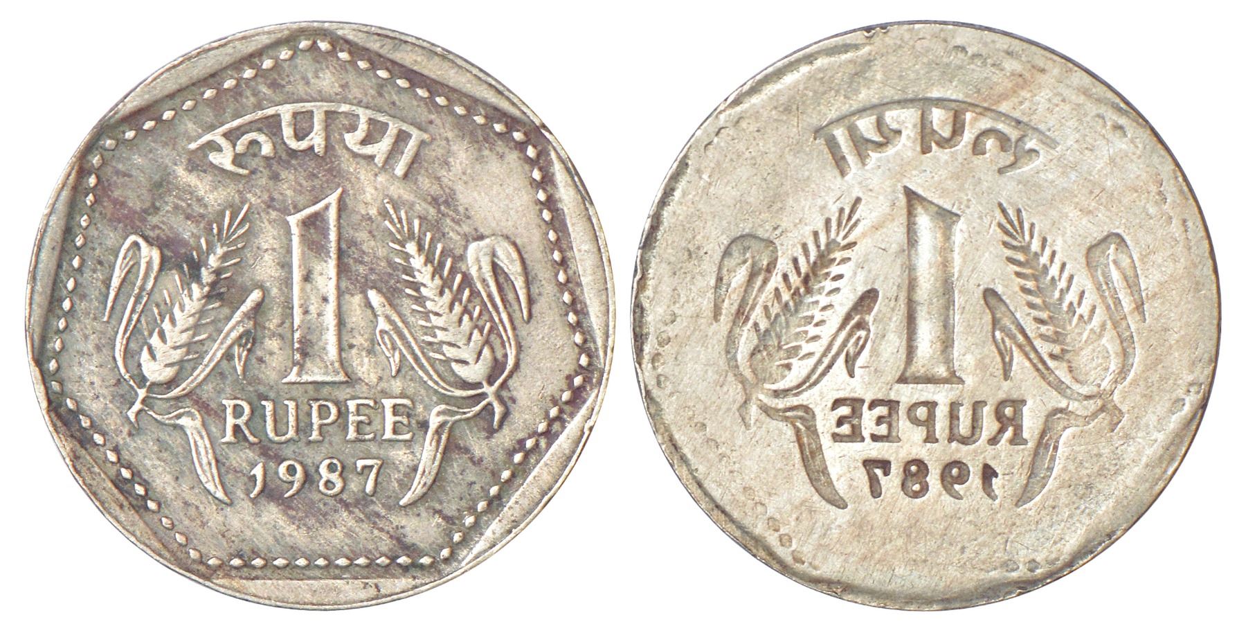 Republic of India, 1987, cupro-nickel, 1 rupee, Calcutta mint, brockage (Lakhi) showing retrograde impression of obverse on reverse.