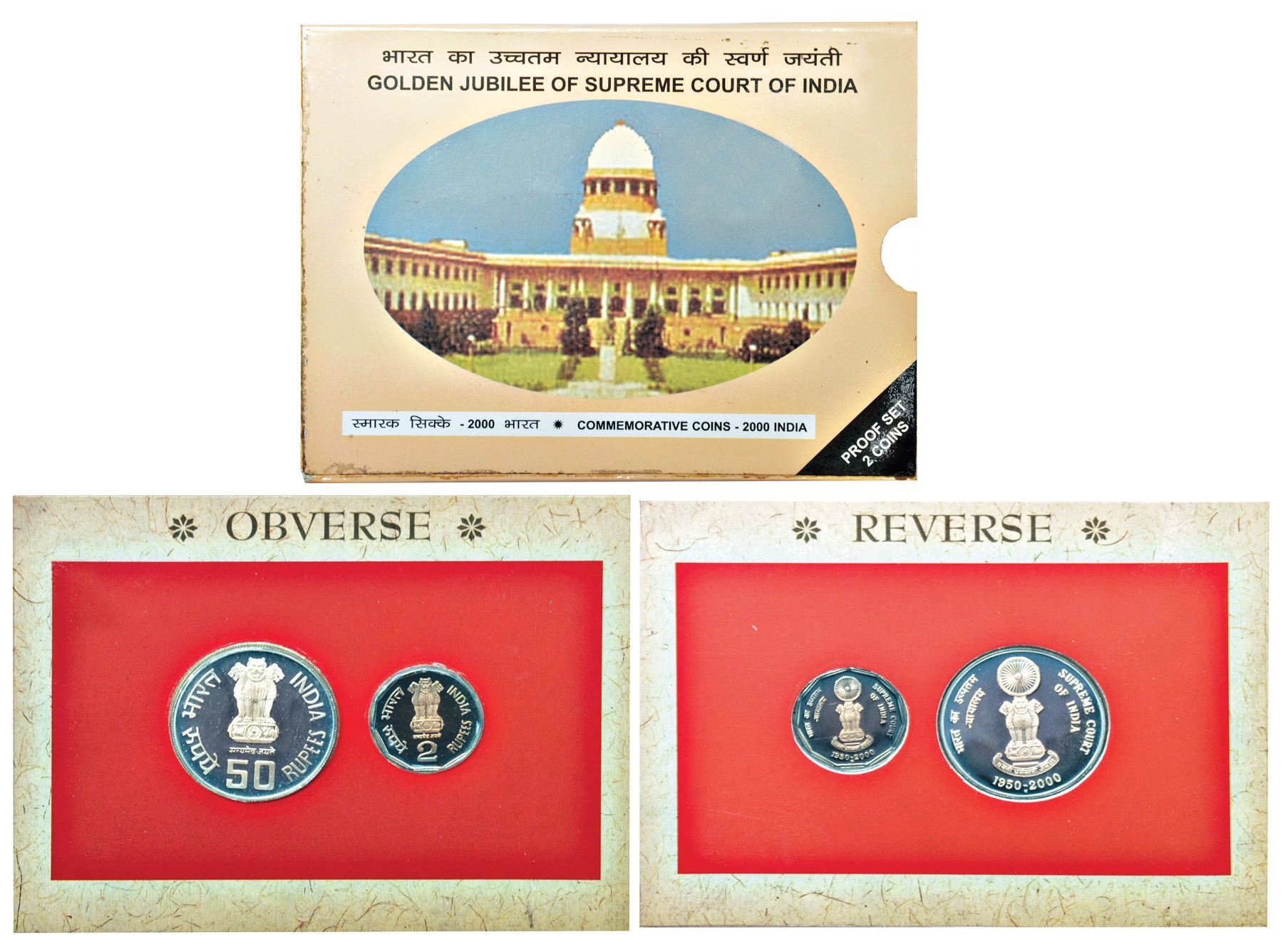 2000, Golden Jubilee of Supreme court of India, Proof set of 2 coins, 50 rupees and 2 rupees, Mumbai mint, RB 233, in original mint packing.