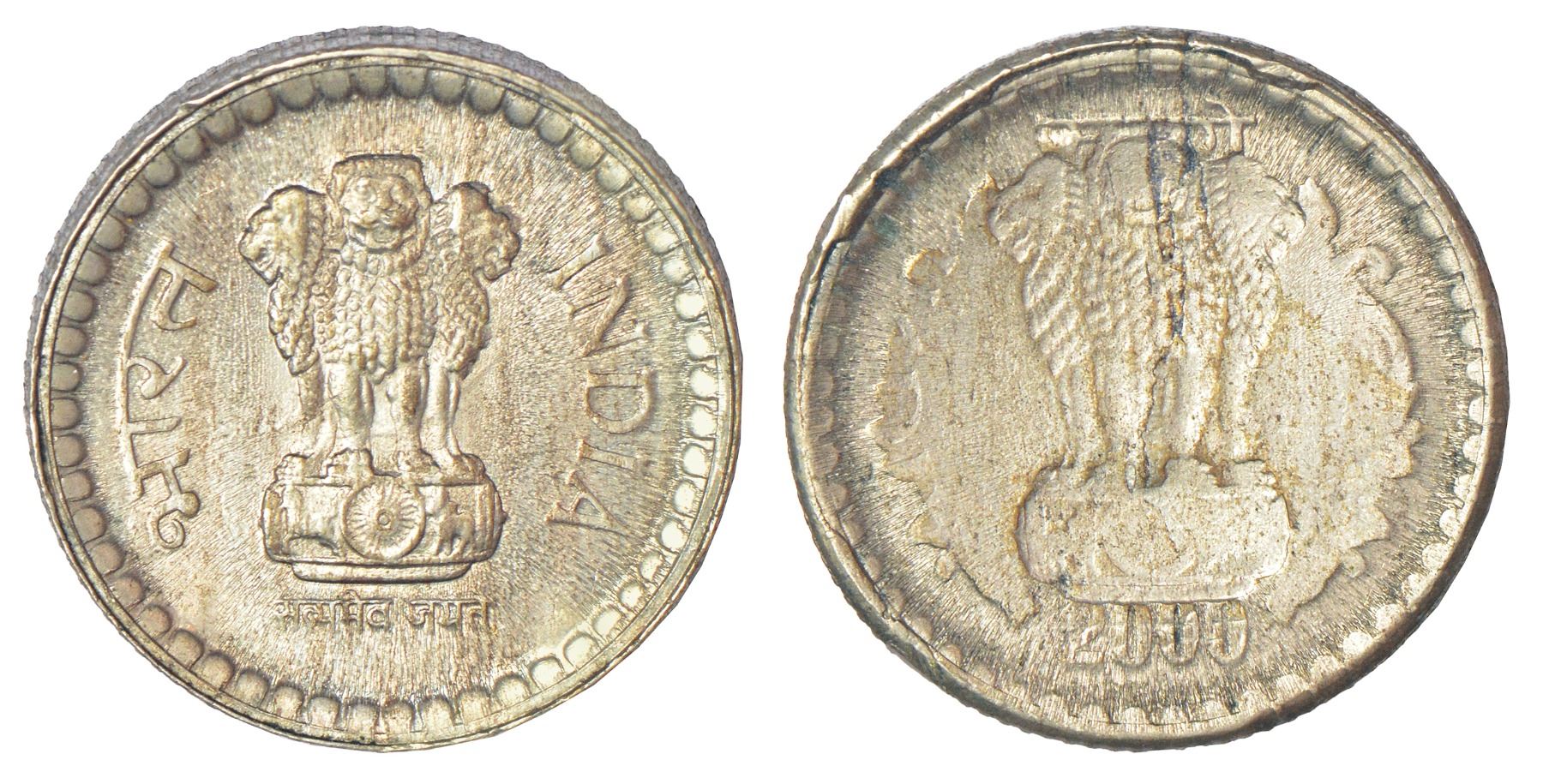2000, copper-nickel, 5 rupees, Calcutta mint, obverse brockage (lakhi) on reverse, 8.80g.