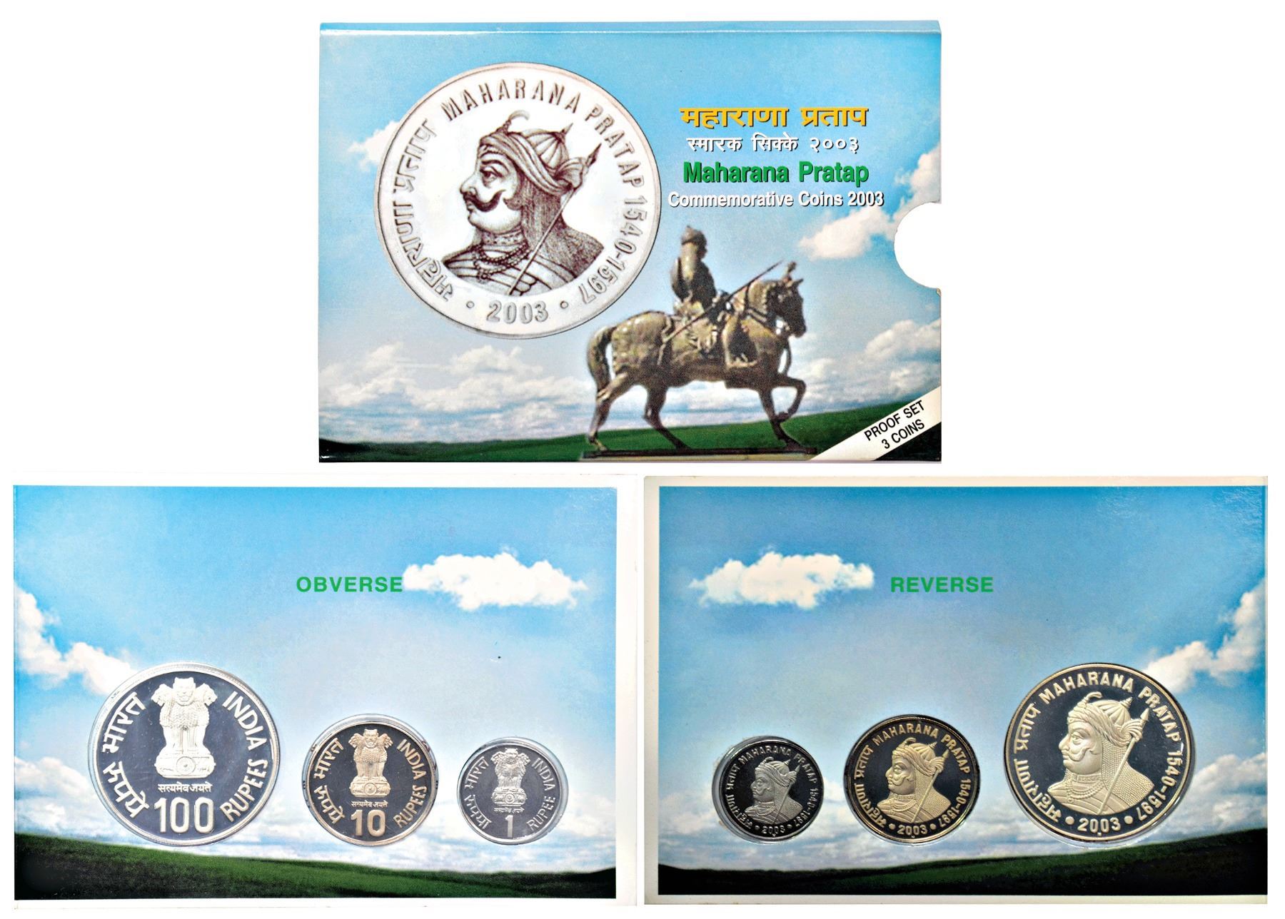 2003, Maharana Pratap, Proof set of 3 coins, 100 rupees, 10 rupees and 1 rupee, Mumbai mint, RB 262, in original mint packing.