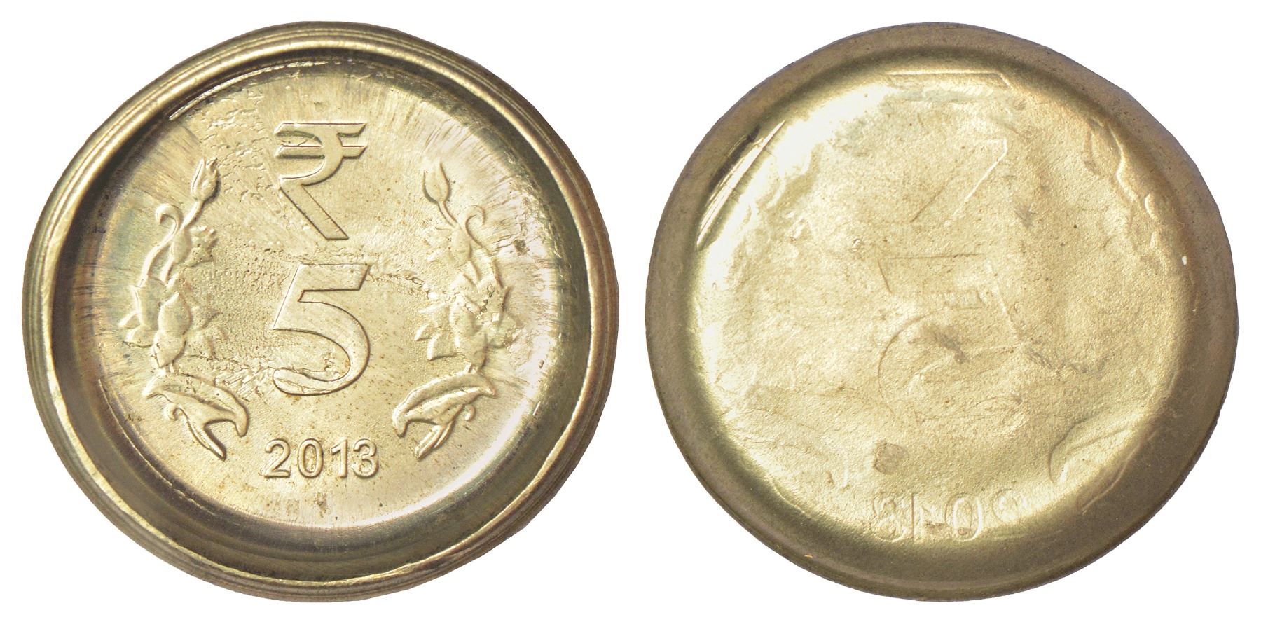 2013, nickel-brass, 5 rupees, Bombay mint, heavy striking on the centre resulted into saucer shape on obverse and reverse brockage (lakhi).