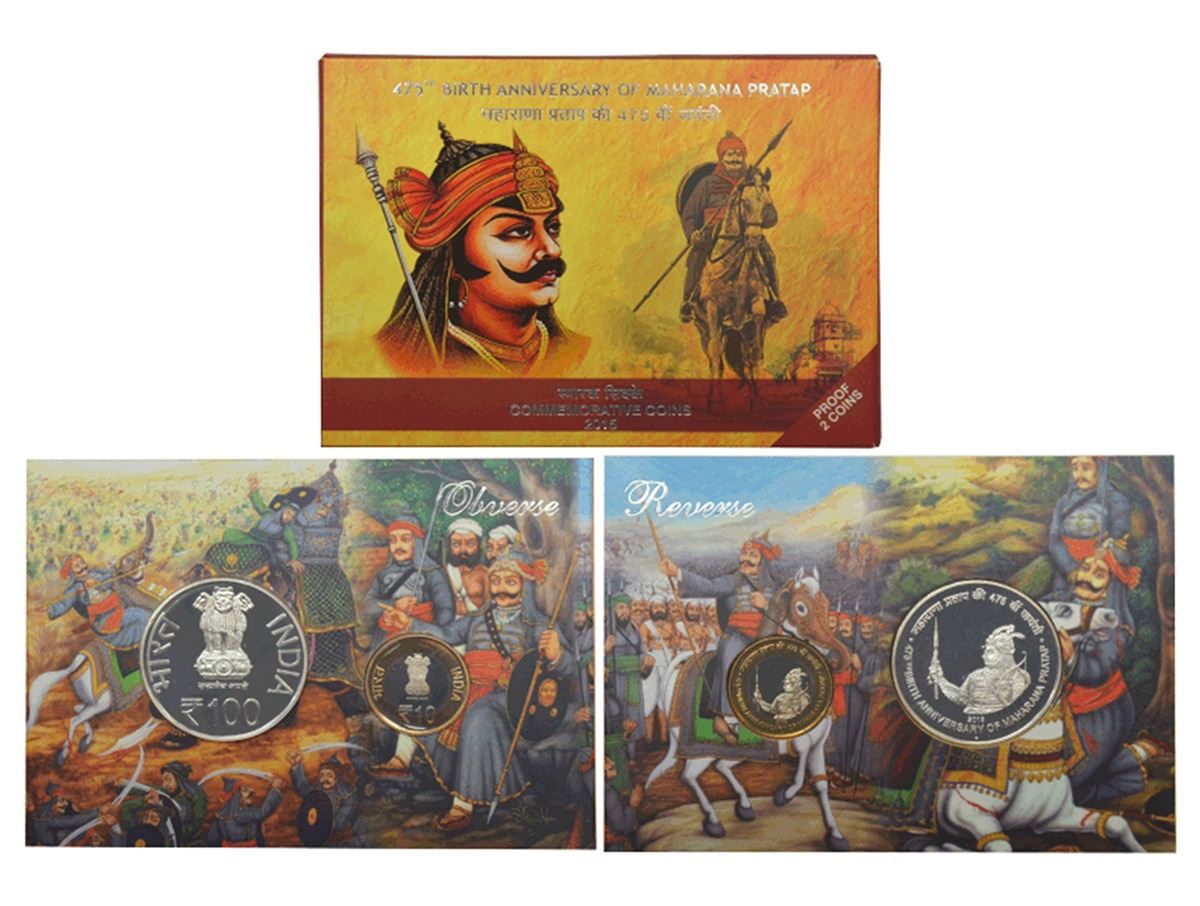 2015, 475th Birth Anniversary of Maharana Pratap, Proof set of 2 coins, 100 rupees and 10 rupees, Mumbai mint, in original mint packing.