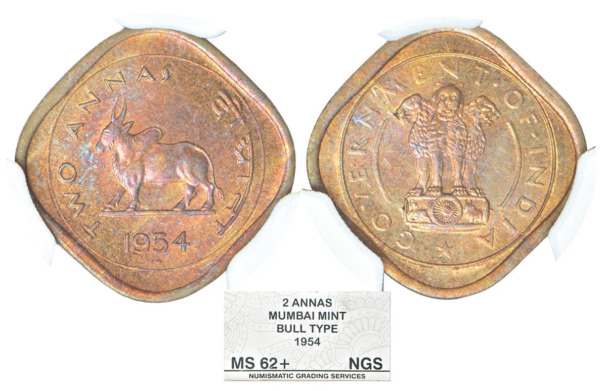 Republic of India: 1954, cupro-nickel 2 annas, Bombay mint, KM 4.2. Obv: Ashoka lion pedestal. Rev: Bull, denomination and date.