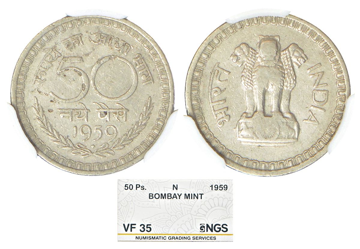 Republic of India: 1959, nickel 50 paise, Bombay mint, KM 55. Obv: Ashoka lion pedestal. Rev: Denomination and date.
