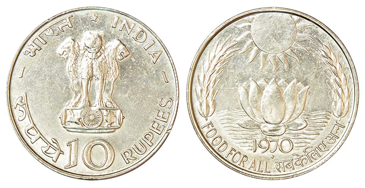 Republic of India: 1970, Food for All, silver 10 rupees, Bombay mint, KM 186, 14.90g.