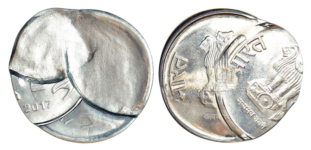 Republic of India: 2017, error, ferratic stainless steel 2 rupees, Calcutta mint, off-centre and multiple struck on both sides, 4.83g.