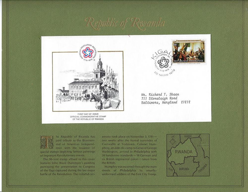 Republic of Rwanda - American Bicentennial Commemorative FDC -22 Mars 1976 - The Republic of Rwanda has commemorated the Bicentennial of American Independence with the issuing of a Special Commemorative Stamp on a Limited Edition First Day Cover