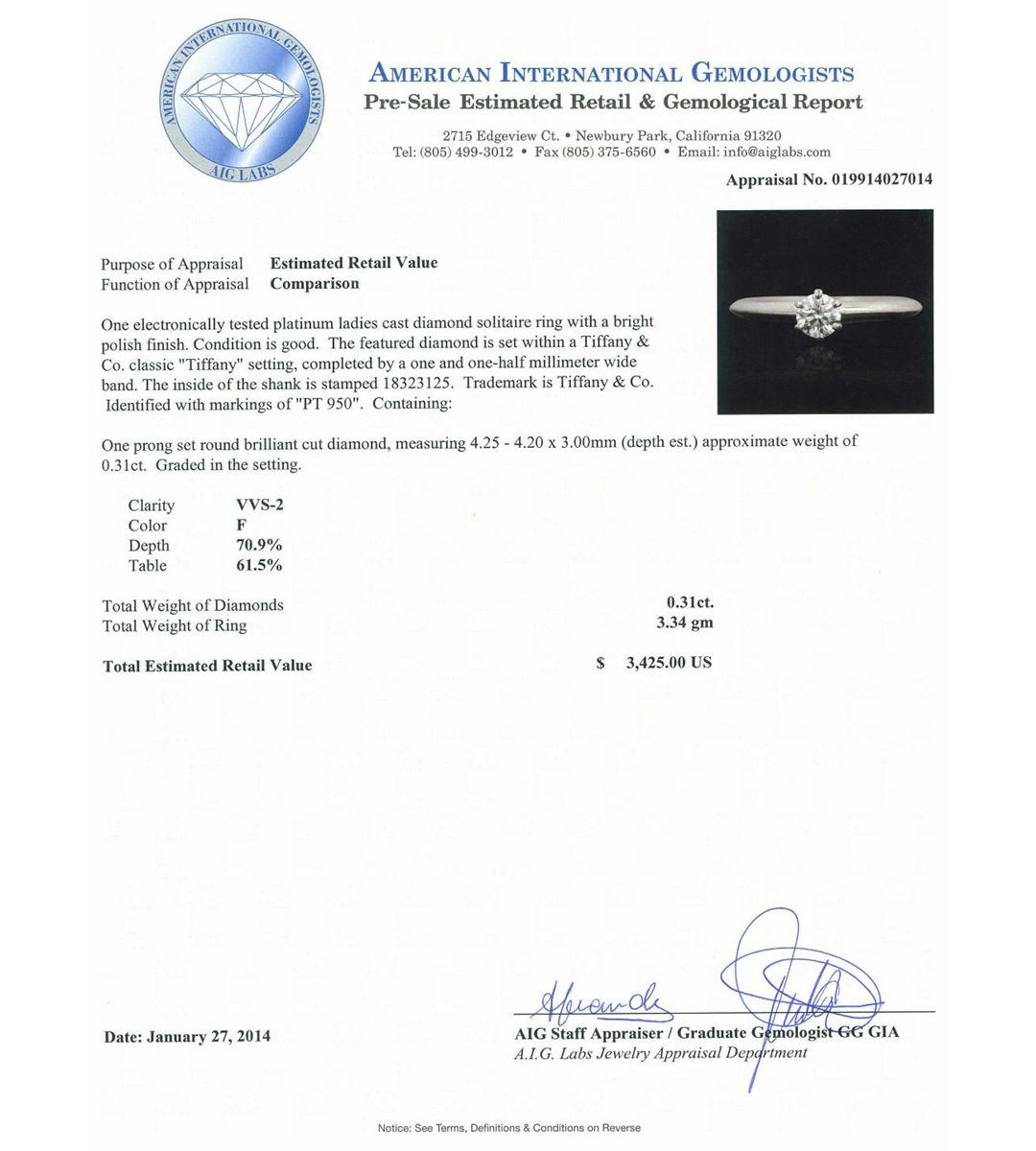 Tiffany & Co Platinum 0.31ct Diamond Solitaire Ring A7491. Good Condition! EX258ZT. One electronically tested platinum ladies cast diamond solitaire ring with a bright polish finish. Condition is good. The featured diamond is set within a Tiffany & Co. classic "Tiffany" setting, completed by a one and one-half millimeter wide band. The inside of the shank is stamped 18323125. Trademark is Tiffany & Co. Identified with markings of "PT 950". Containing: One prong set round brilliant cut diamond, measuring 4.25 - 4.20 x 3.00mm (depth est.) approximate weight of 0.31ct. Graded in the setting. Clarity VVS-2. Color F. Depth 70.9%. Table 61.5%. Total Weight of Diamonds 0.31ct. Total Weight of Ring 3.34 grams. AIG appraised at $3,425.00.