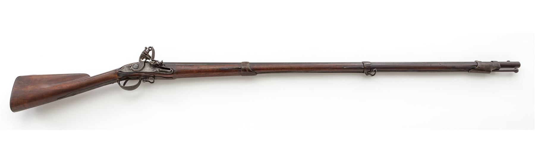 Revolutionary War Era French Charleville Model 1763-66 Flintlock Infantry Musket, NVSN, .69 cal., 44'' barrel with bayonet lug at muzzle marked ''C'' near the breech and has three spring-retained barrel bands (top band of the double-strap type with integral blade front sight and ramrod channel, middle band with sling swivel); bevel-edge lockplate with a pointed teat at rear is marked ''Charleville'' in script beneath the pan; other steel furniture consists of a serpentine sideplate, triggerguard having long top and bottom tangs and a sling swivel at front of bow, buttplate, and button-tip ramrod; oil-stained European walnut fullstock nicely carved where the slim wrist meets the comb. Appears to be in original flintlock configuration with unbushed touchhole and all original parts. Condition is very good, the steel parts having a mostly smooth deep-brown age patina with scattered erosion. Stock is smooth and solid having a crack at wrist and sideplate, but sound, a minor loss at rear of lockplate, ''ED'' carved at left butt, and nice grain and color. Action is strong; bore is clean with erosion toward muzzle. Est.: $1,500-$2,500. (Antique)