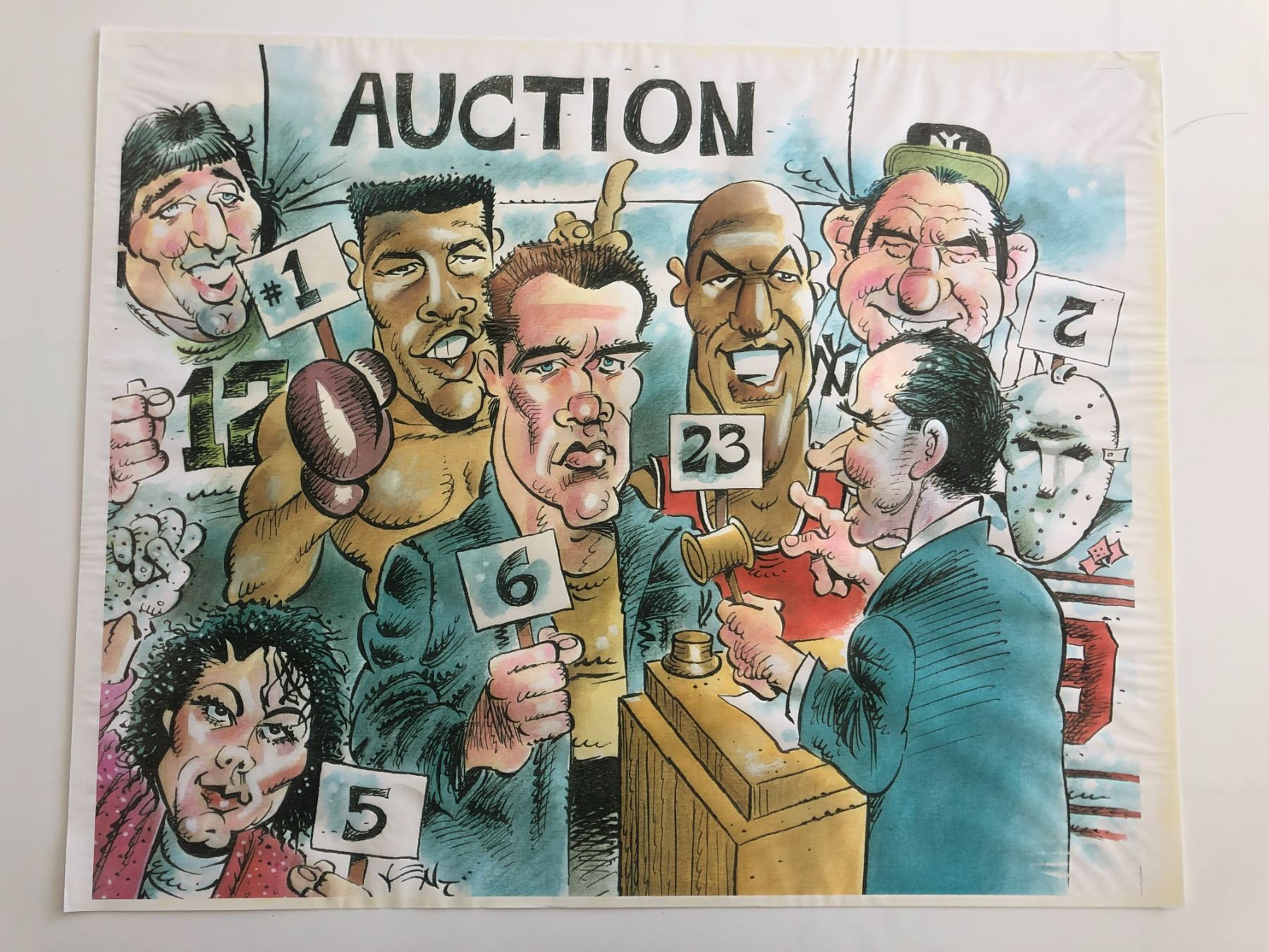Richard Nixon Celebrity Auction Caricature Print. Michael Jackson, Arnold Schwarzenegger. 30x24 inches