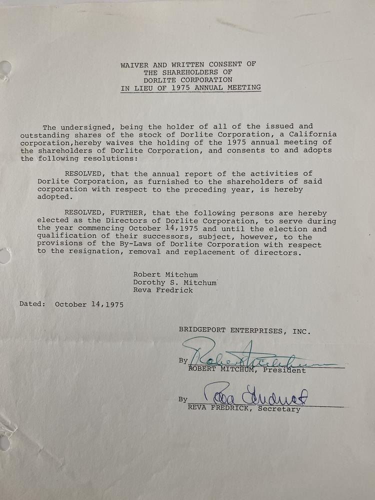 Robert Mitchum signed Dorlite Corporation 1975 annual meeting notes