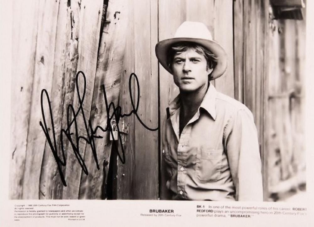 8 in. by 10 in. Black and white movie still photo from "Brubaker" autographed by Robert Redford.