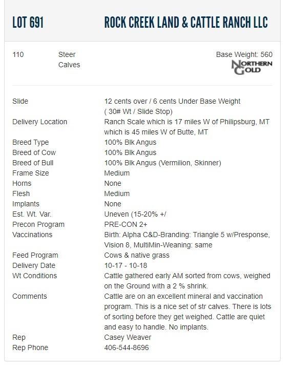 Rock Creek Land & Cattle Ranch LLC - 110 Steers; Base Weight: 560