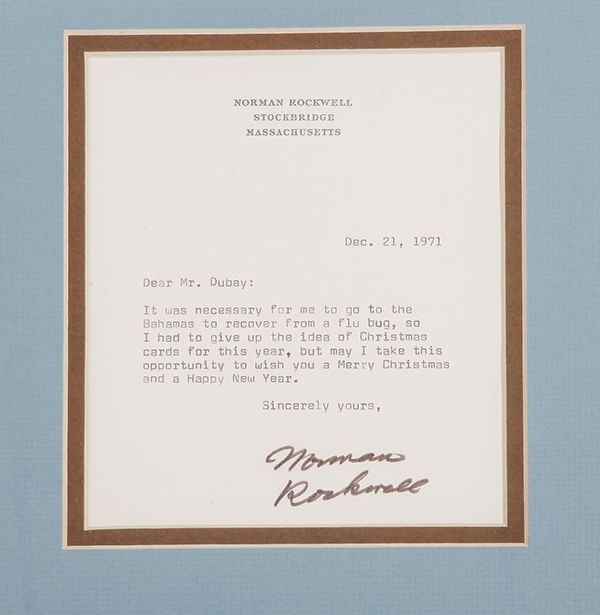 Rockwell, Norman (1894-1978) American painter and illustration best known for his depictions of small-town America, many of which graced the covers of The Saturday Evening Post. Typed letter signed, on personal letterhead, 1 page, 5 x 5� in., Stockbridge, Mass., 21 Dec. 1971. Sending seasons greetings to a friend after convalescing from the flu in the Bahamas. Matted with an image of Rockwell and framed to an overall size of 14� x 20� in.