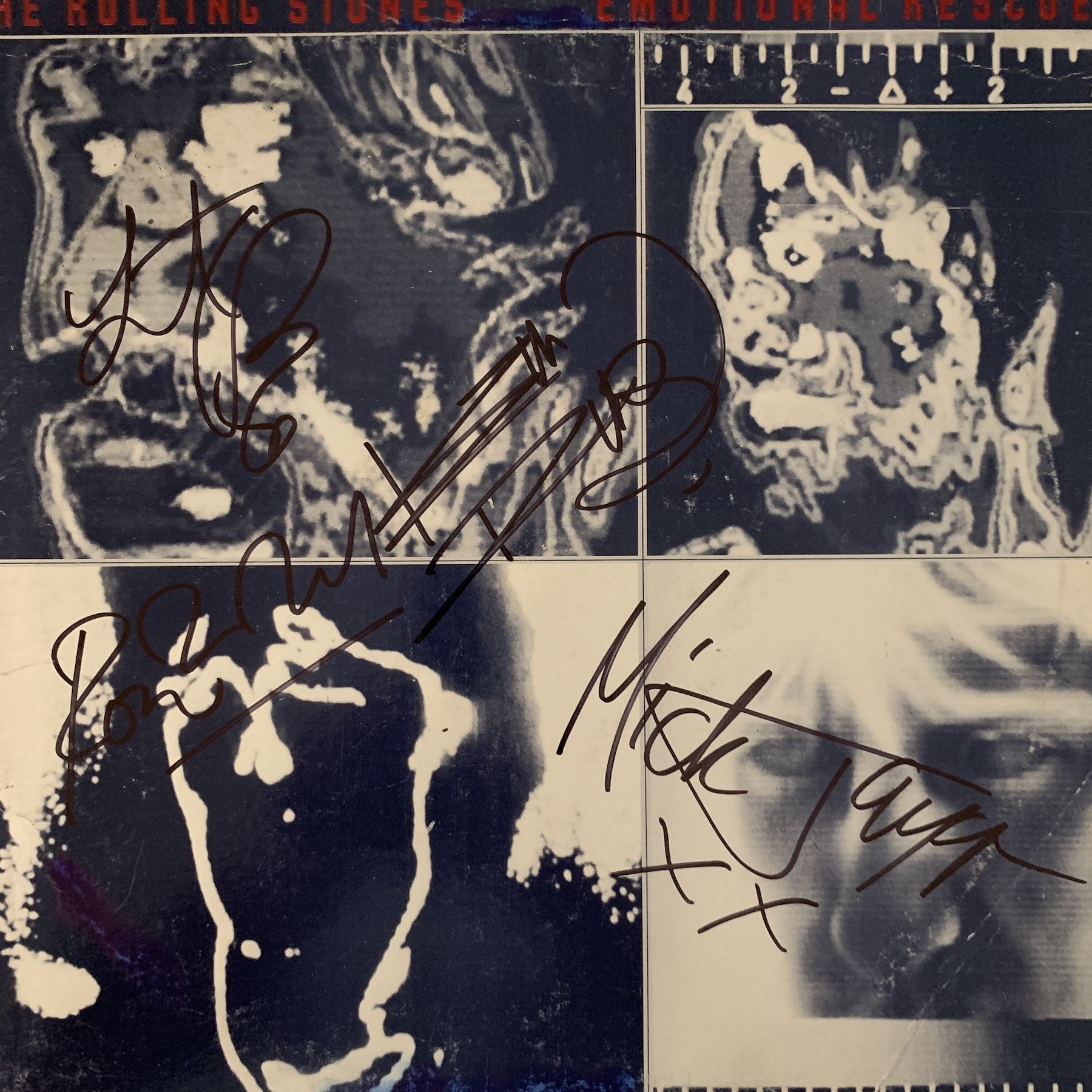 Rolling Stones Emotional Rescue album autographed by Mick Jagger,Ronnie Wood, Keith Richards and Charlie Watts Vinyl is included
