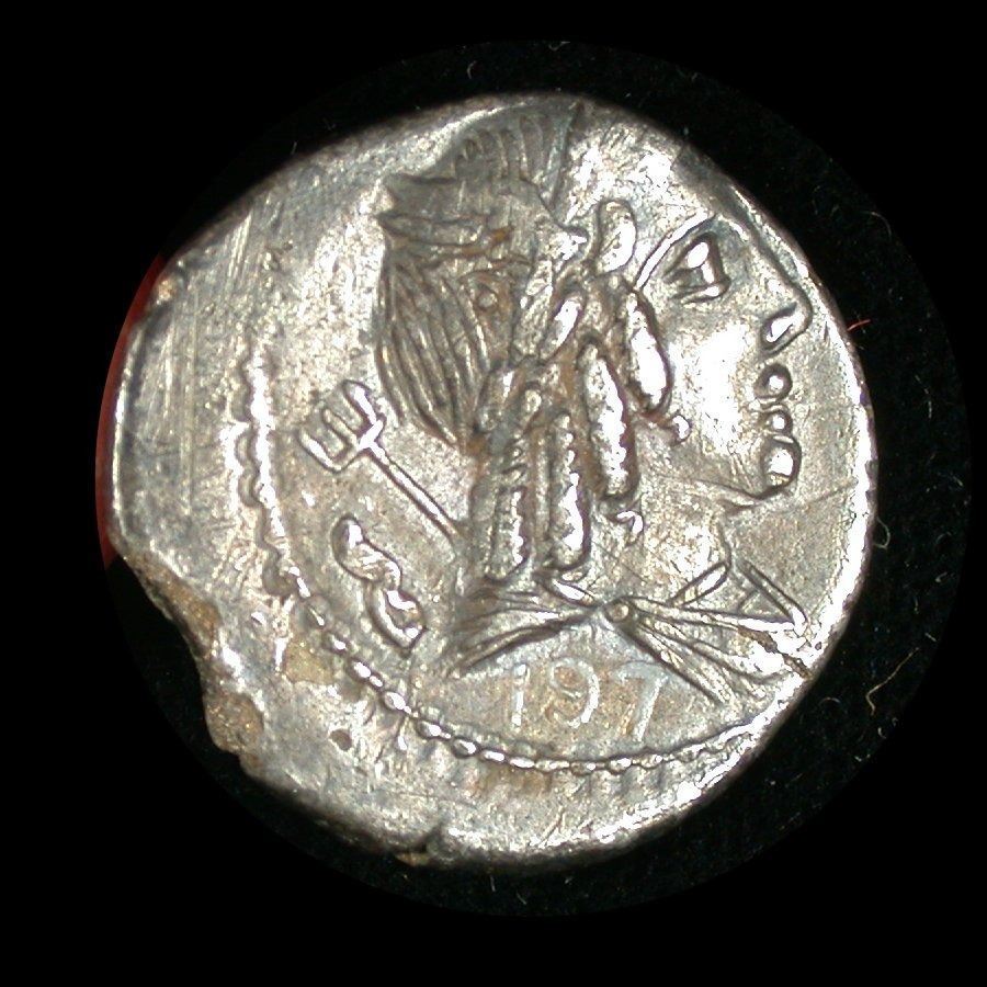 This issue by Lucius Julius Bursio has a rich variety of obverse symbols that are paired with the trident. A capis is a genus of moths