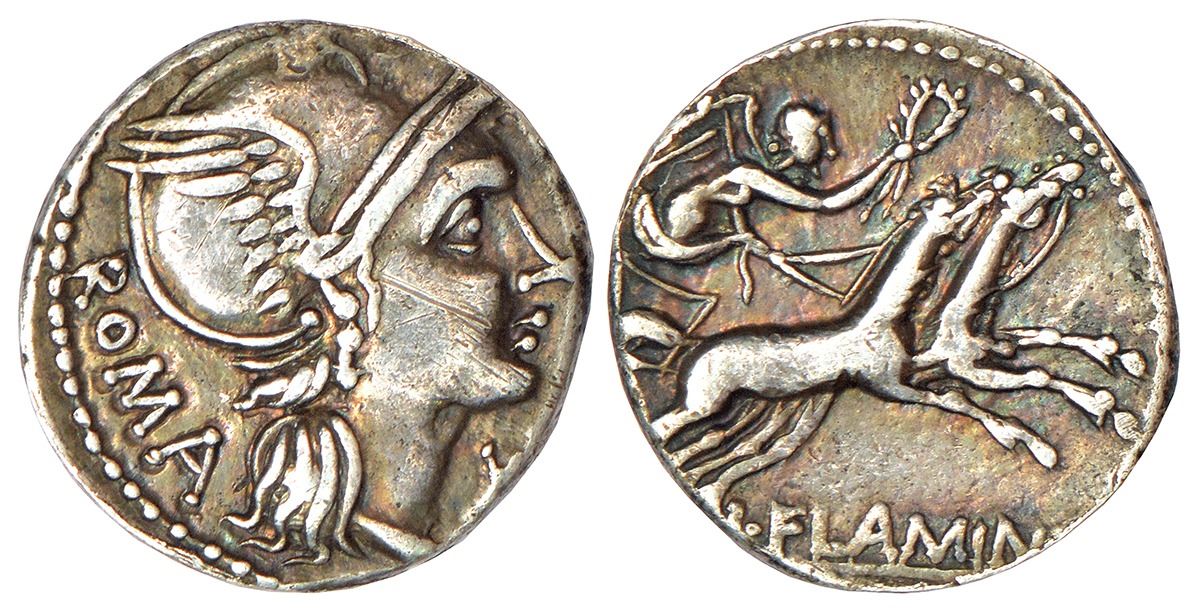 Roman Republican Coinage, Lucius Flaminius Cilo, silver denarius, struck 109-108 BC, Rome mint, 3.77g. Obv: helmeted head of Roma facing right, X below chin, ROMA behind. Rev: Victory driving galloping biga (two-horse chariot) to right, holding reins and wreath; L. FLAMINI below.