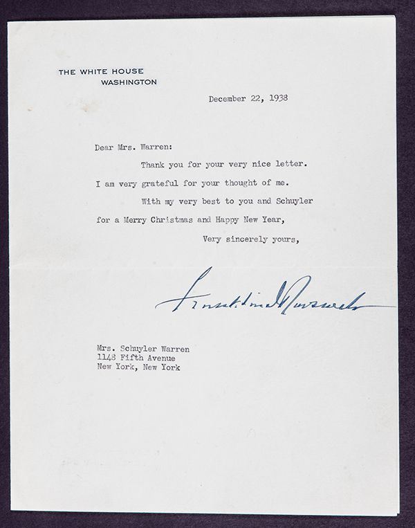 Roosevelt, Franklin D. Typed letter signed as President on The White House letterhead, 1 page, 7 x 9 in., Washington, 22 Dec. 1938. To Mrs. Schuyler Warren, a "society" friend of FDR's mother, Sara, thanking her for her "very nice letter" and wishing her and her husband a Merry Christmas and Happy New Year. Mrs. Warren was characterized as "mistress of a New York literary salon." Accompanied by a New York Times story, dated 12/24/29, naming Mrs. Warren, and Mrs. James (Sara) Roosevelt.