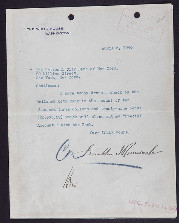 Roosevelt, Franklin D. Typed letter signed as President on The White House letterhead, 7 x 9 in., Washington, 5 April 1940. To The National City Bank of New York stating that he has written a check in the amount of $2,003.29, which will close out his "Special Account" with the bank. Initials of bank officials, bank stamps, and file holes do not affect text or signature. Very good.