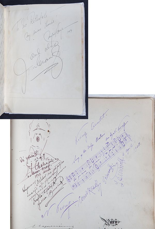 [roxy and His Theaters] Autograph Album With Hundreds of Tributes. Album containing a collection of hundreds of signatures and tributes to Samuel "Roxy Rothafel, director of NYC movie and theater palaces, incluing the legendary eponymous Roxy and the Radio City Music Hall, whose "Rockettes" were originally the "Roxyettes." "Roxy" was a film exhibitor, stage producer, radio broadcaster, musical arranger, theater manager, war propagandist, and more. He was also a former Marine and his ushers were famous for their military bearing. Many of his military friends signed the album, among them JIMMY DOOLITTLE and Rear-Admiral F.R. BASSETT.