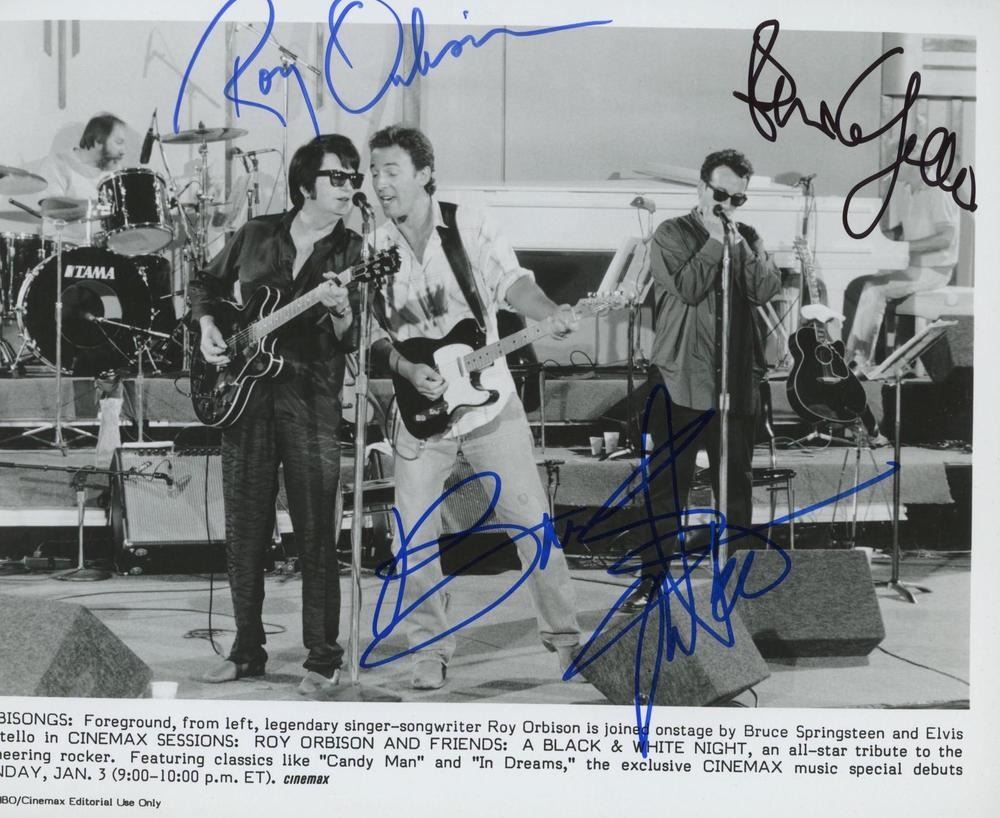 Orbisongs signed photo autographed by music legends Roy Orbison, Bruce Springsteen and Elvis Costello. 8x10 in. This item is a reprint of an original autograph.